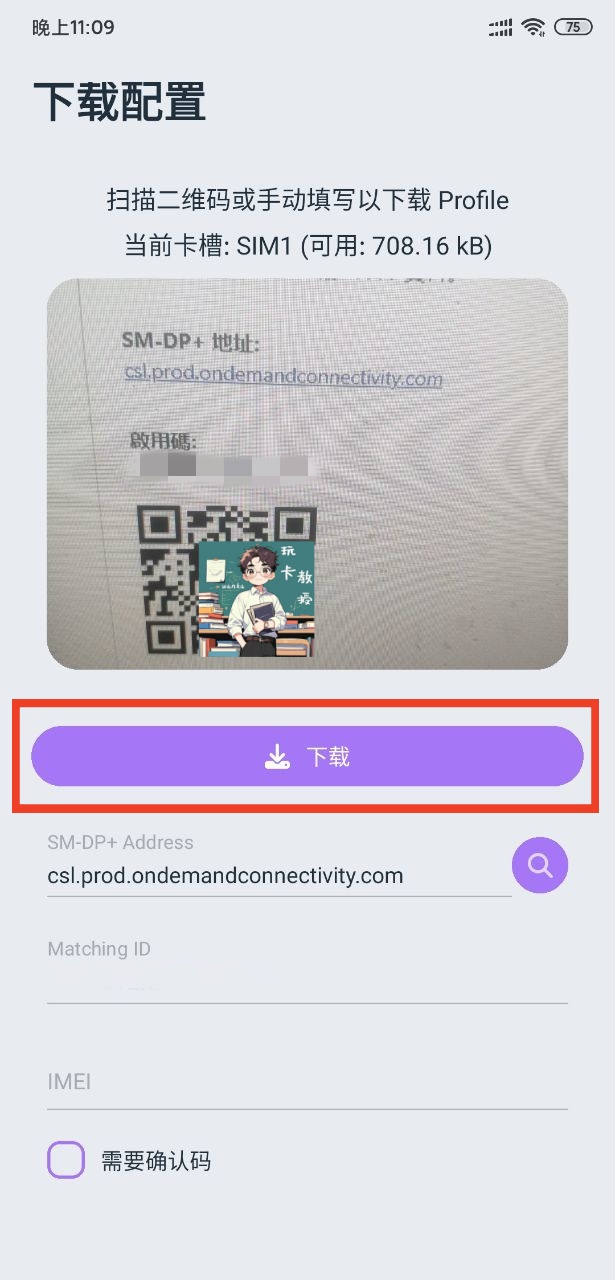 打开9eSIM,点击右上角+号,扫描屏幕上的二维码,点击下载,确认配置,点击:下载