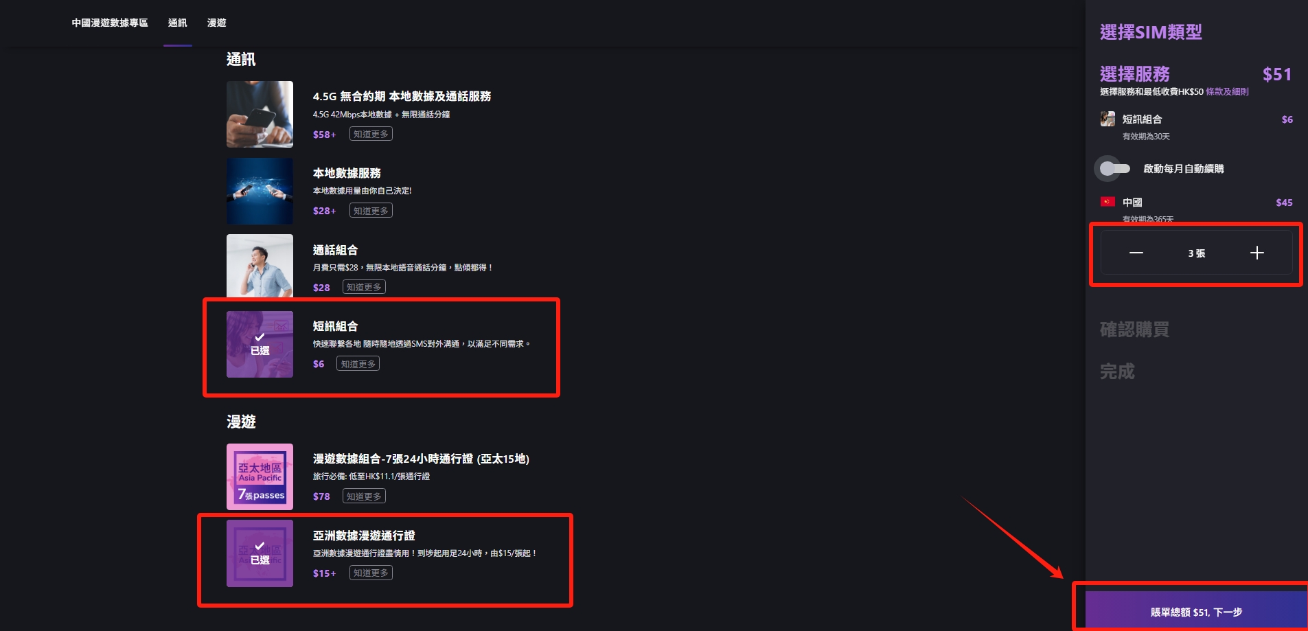 自由搭配服务,推荐大家选择6元的短信组合+3张数据漫游通行证,合共51元(付款金额大于等于50即可),点击下一步