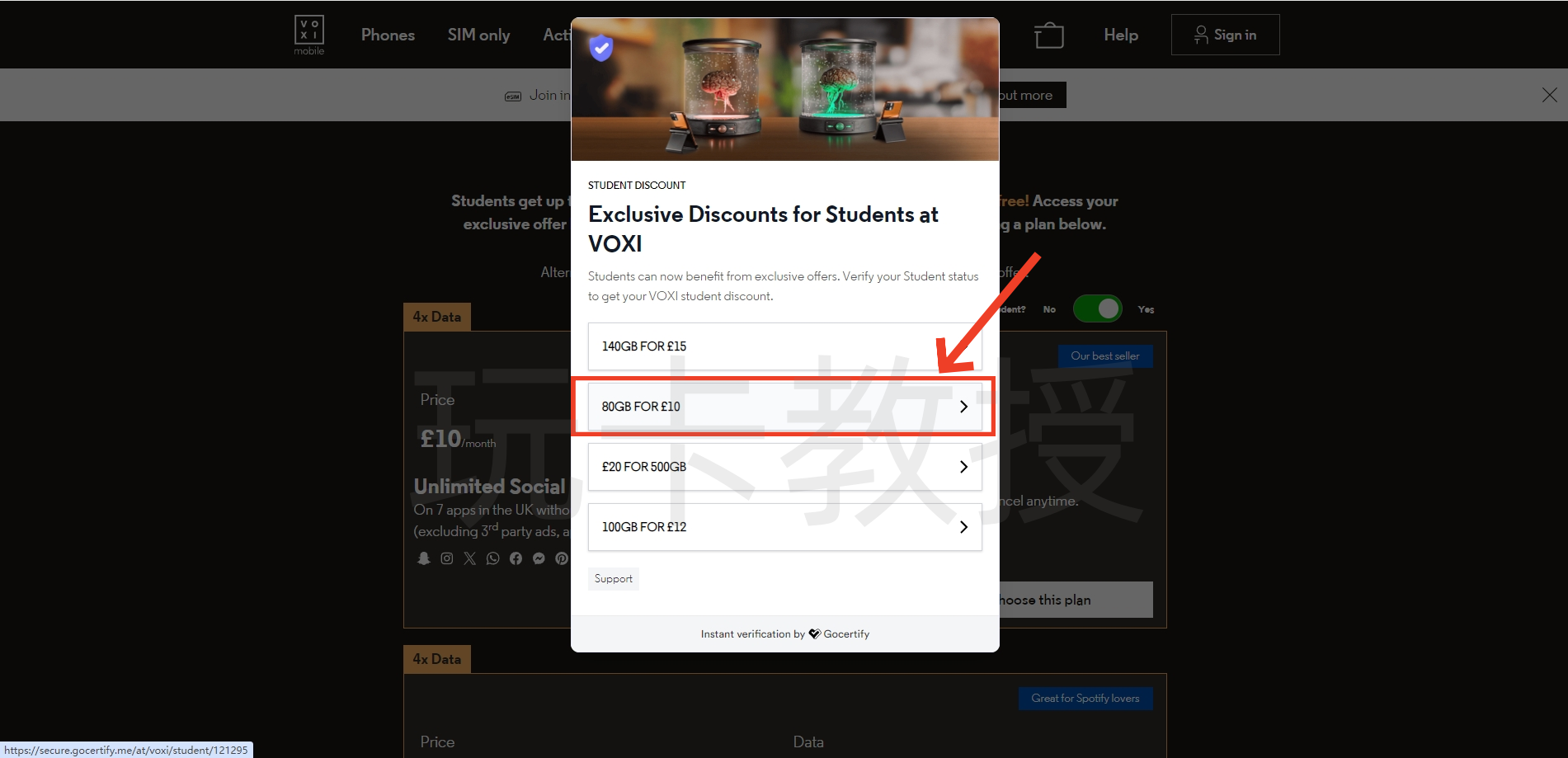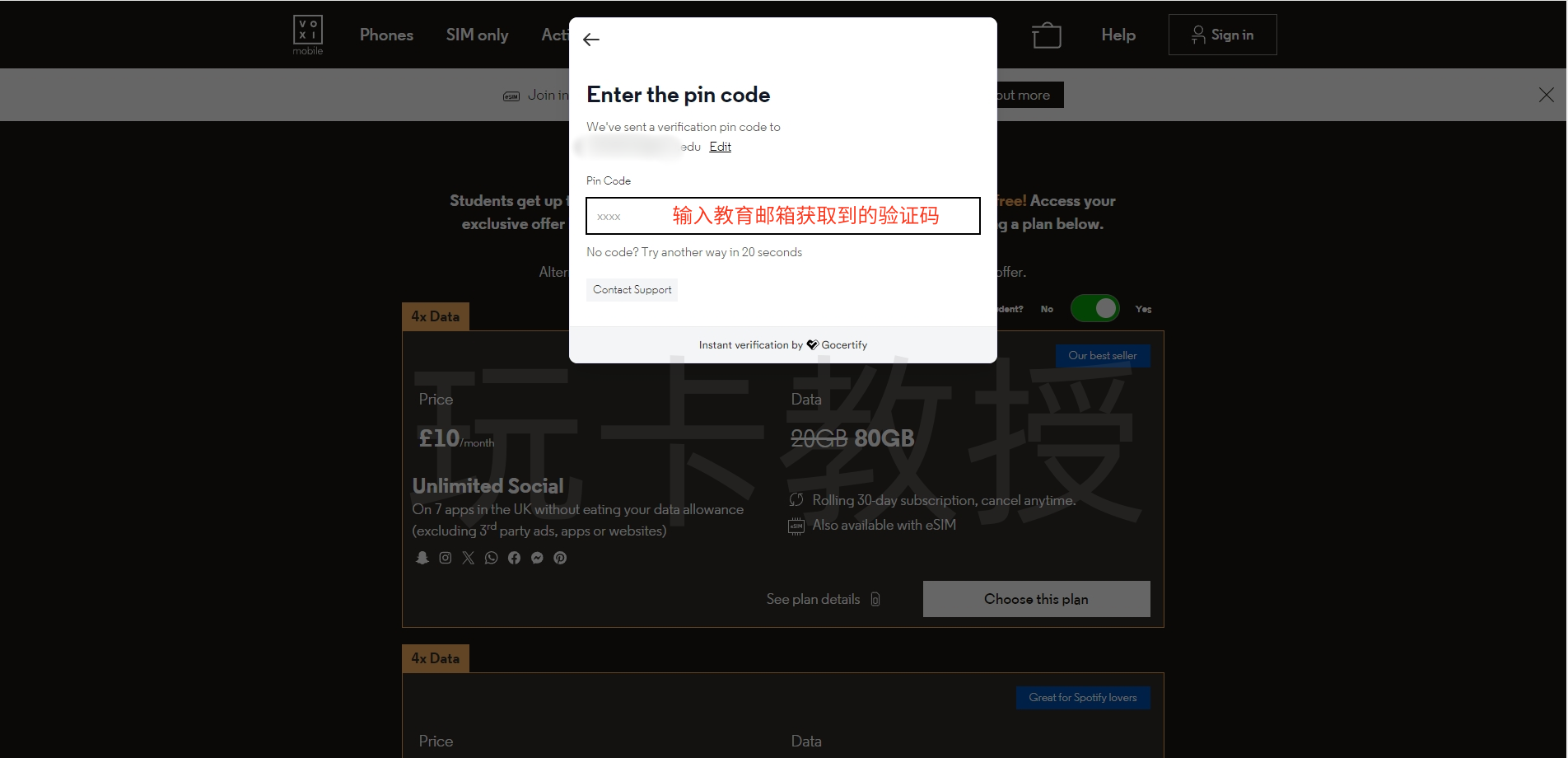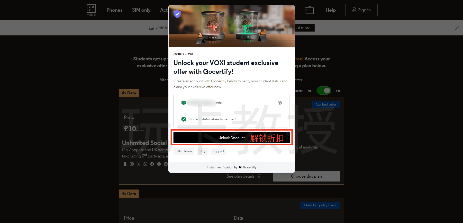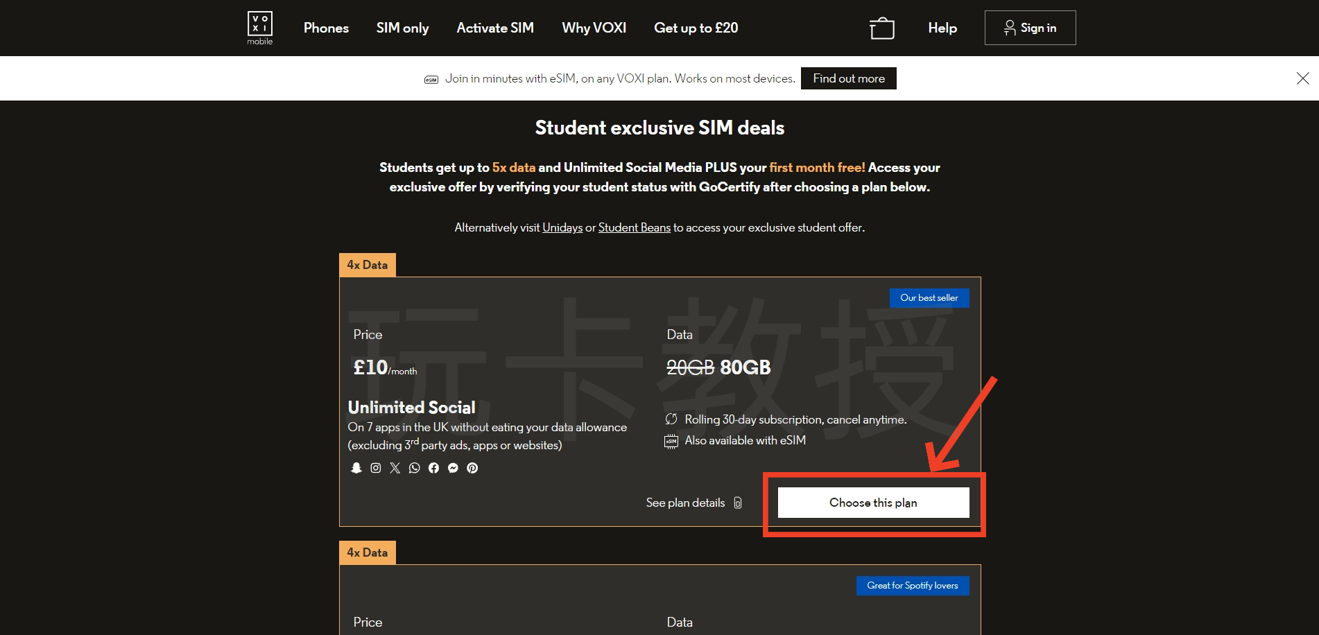 进入:https://www.voxi.co.uk/acquisition/students,选择10英镑的套餐,点击:Choose this plan