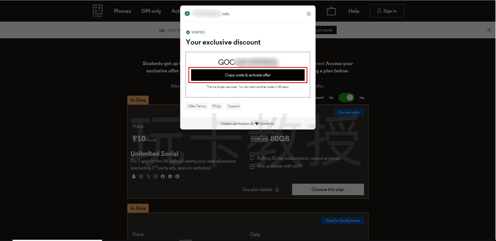 就看到我们的优惠码,点击:Copy code & activate offer,就会自动复制折扣码并转跳激活优惠页面