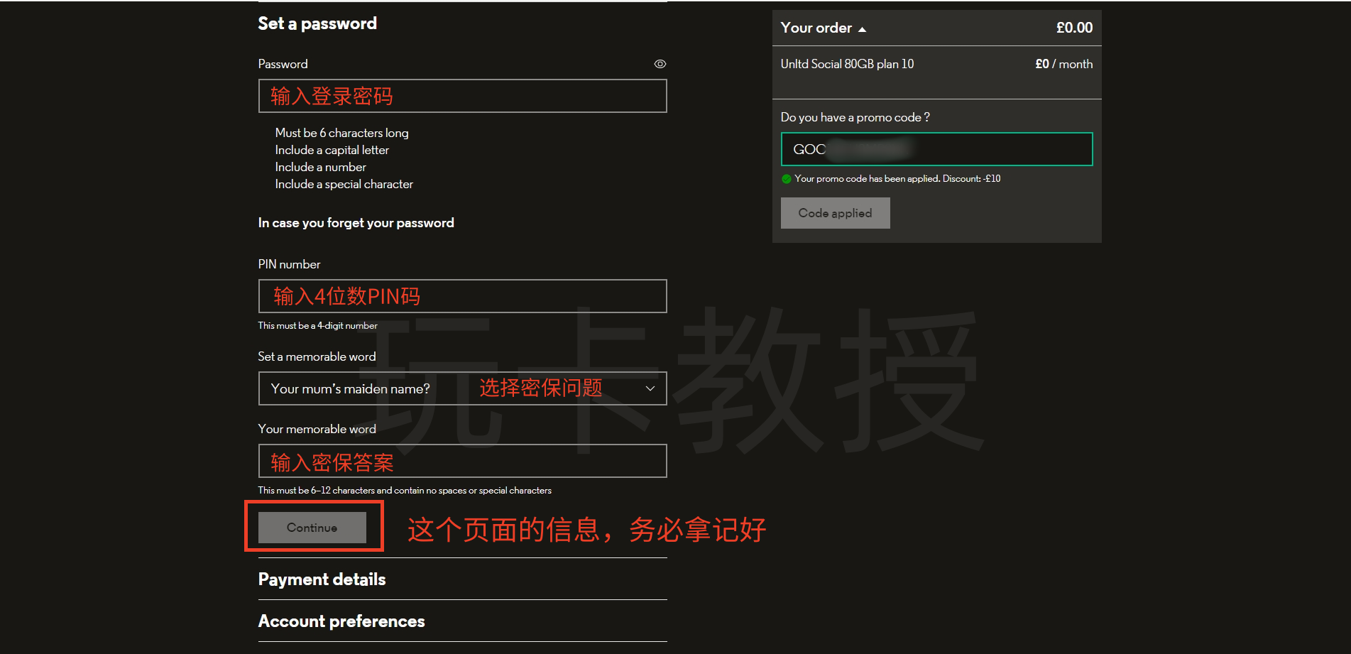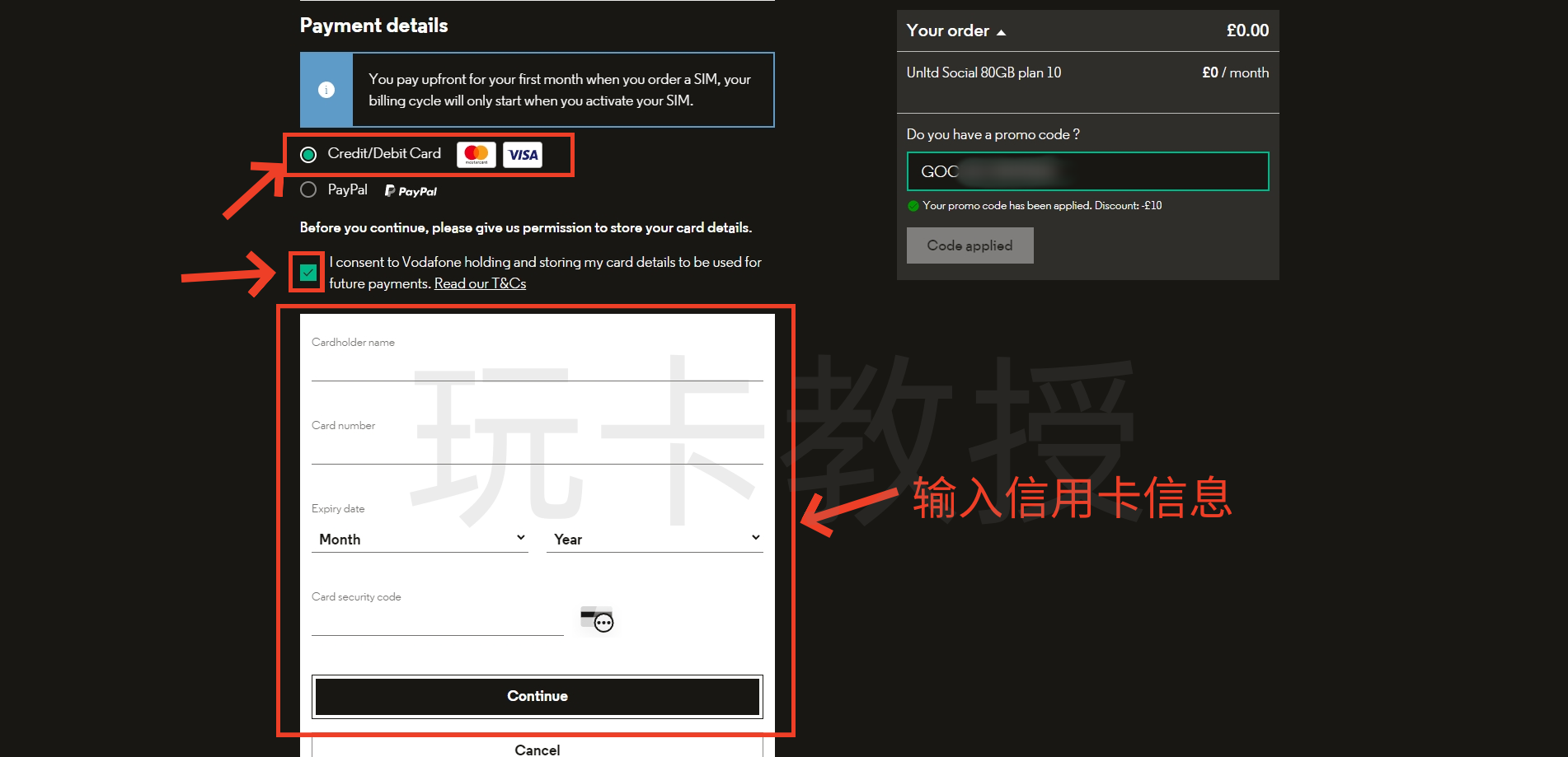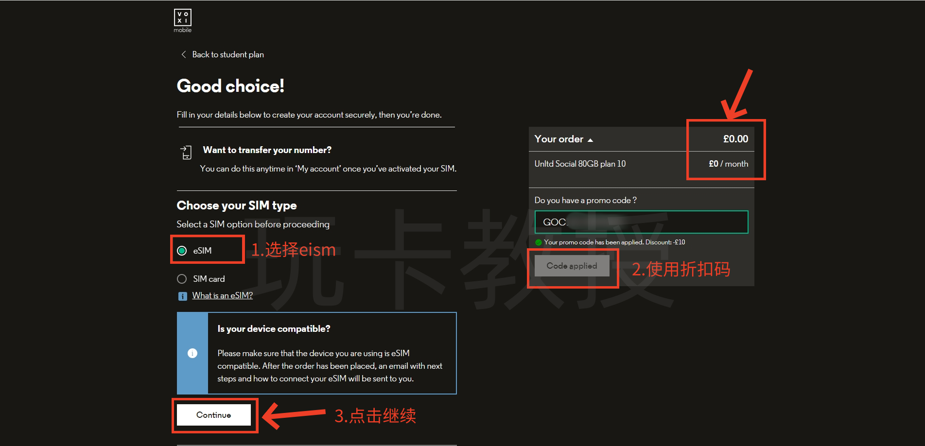 选择eSIM,黏贴优惠码使用后,就看到月租变成£0(第一个月),点击:Continue