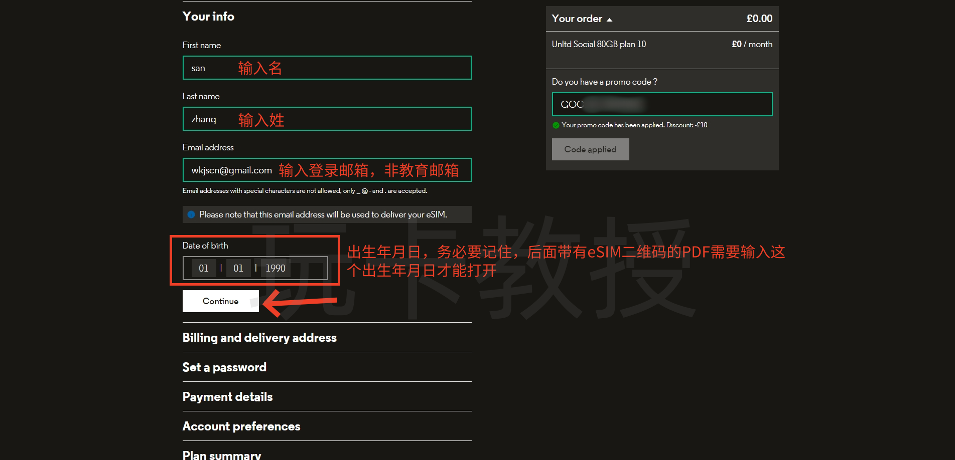 输入姓和名,输入登录邮箱,非教育邮箱,出生年月日,务必牢记,后面会有一个带有eSIM二维码的PDF发到你邮箱,密码就是您设置的出生年月日,如0101990,密码就是0101990