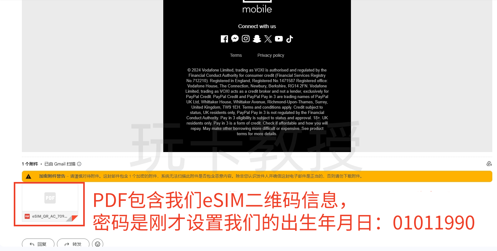 收到邮件后,我们拉到最后就看到eSIM信息的PDF,点击打开,输入密码(密码是刚才我们设置的出生年月日,刚才设置的是01011990,密码就是01011990)
