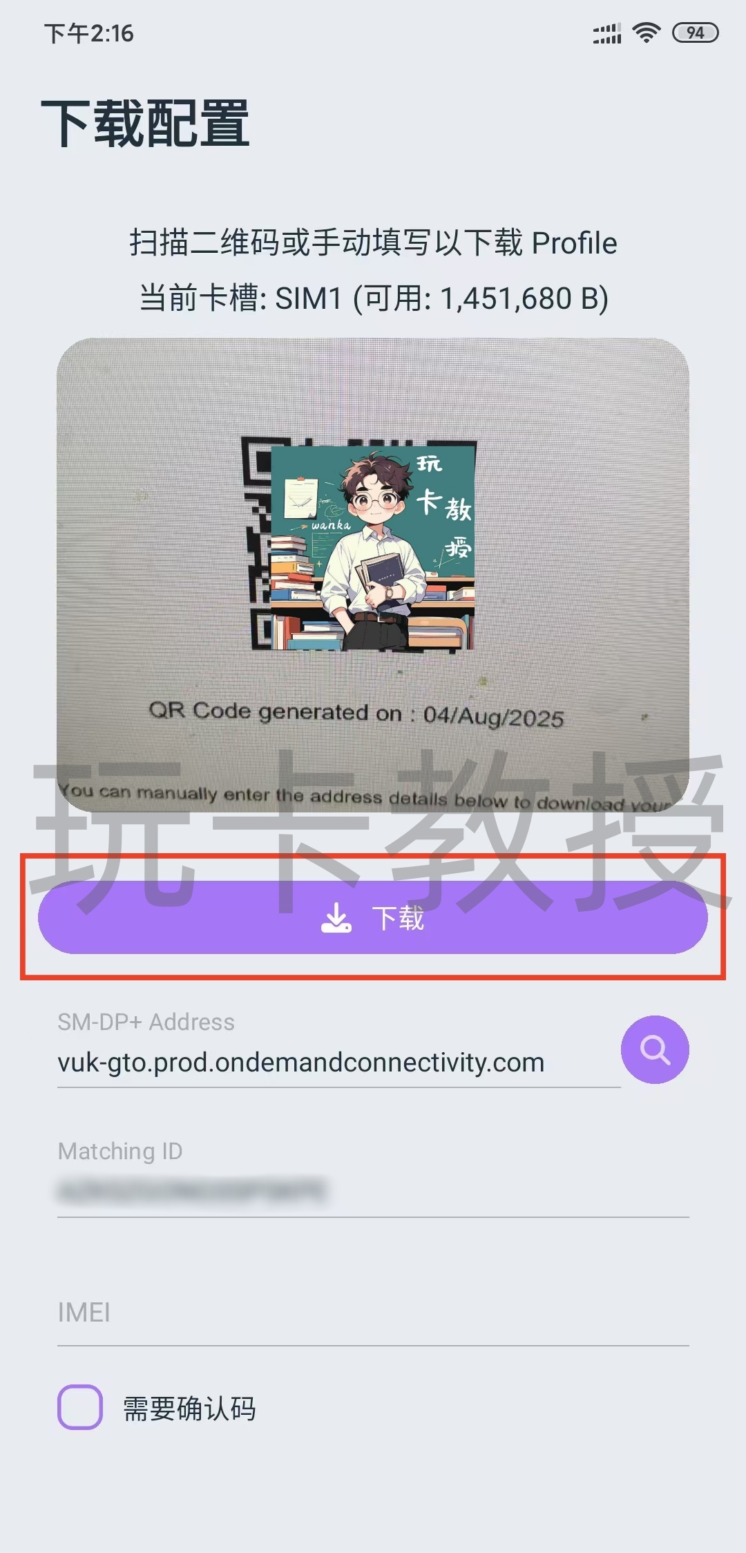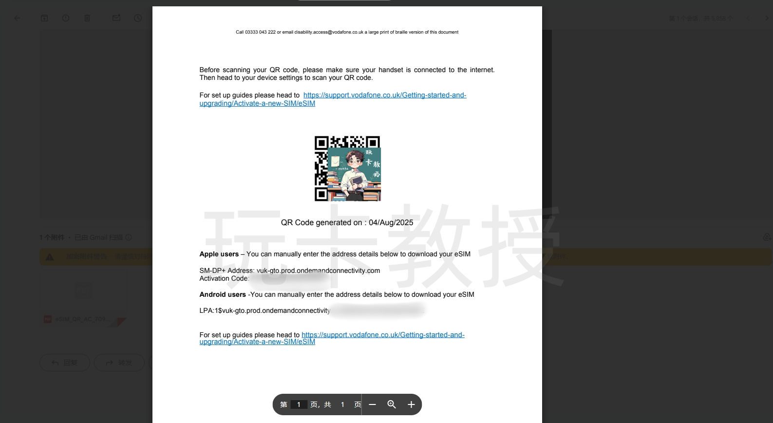 打开PDF后,就看到eSIM的相关信息(eSIM二维码,SM-DP+ Address)