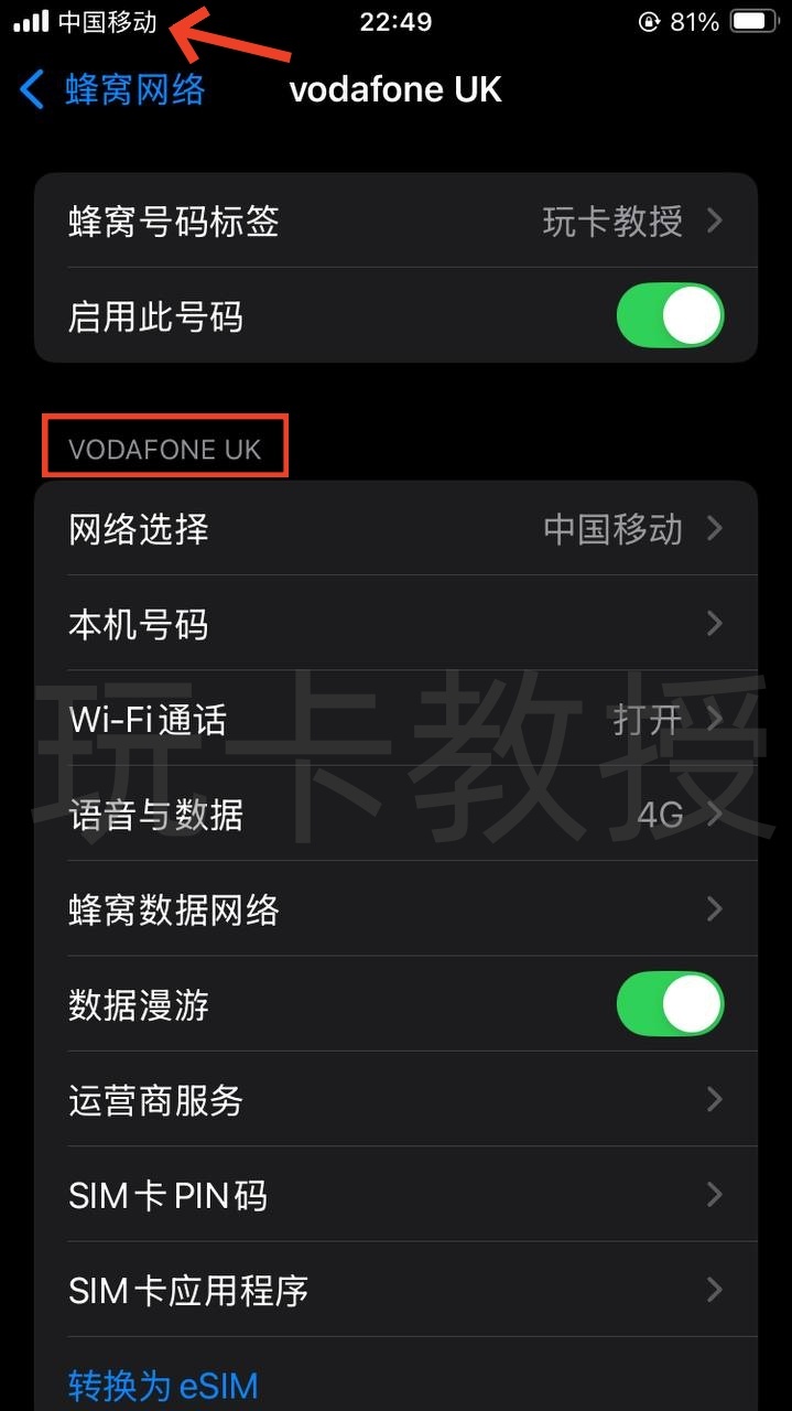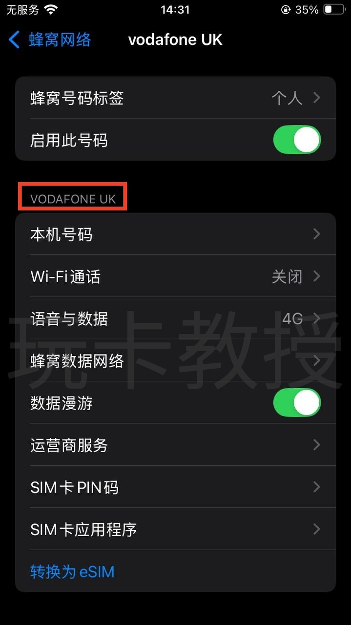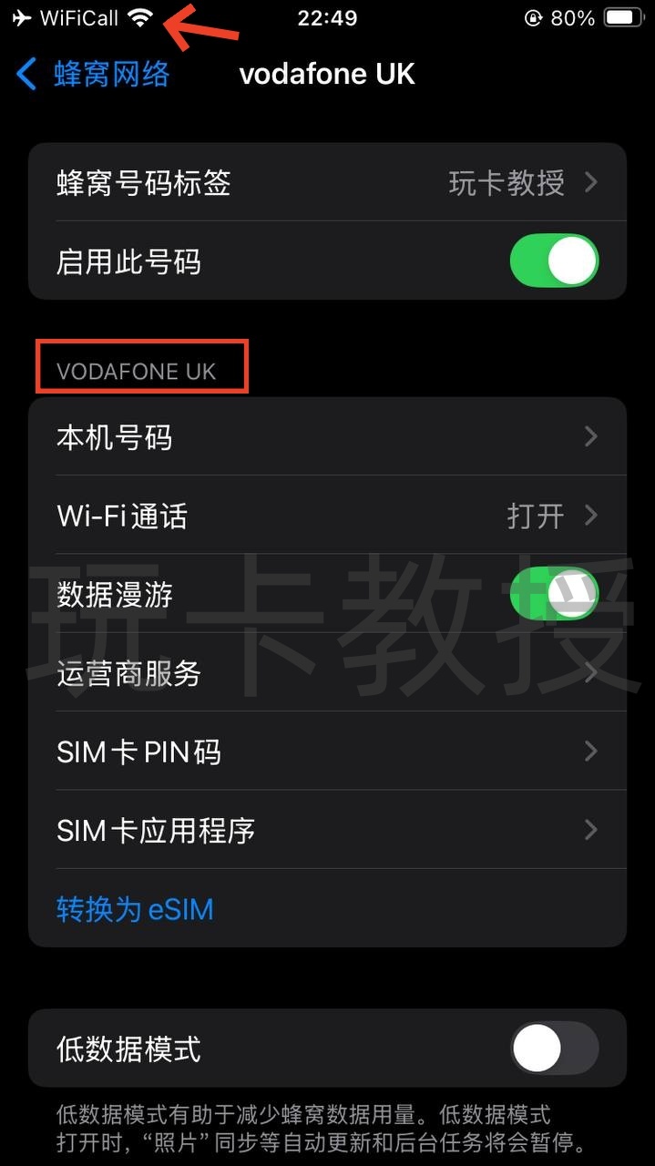 方法2:有iPhone的小伙伴,把9esim插到iPhone,使用英国节点拉起一次WIFI Calling后就会出现信号