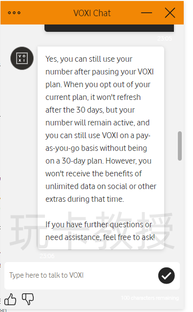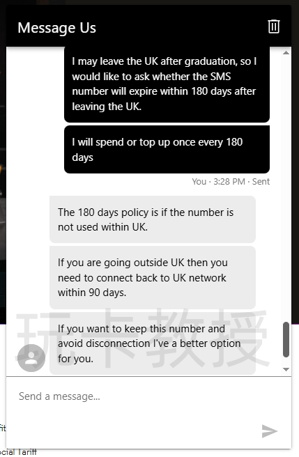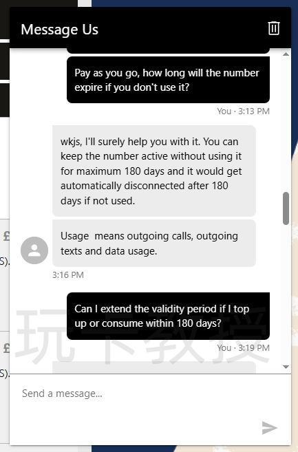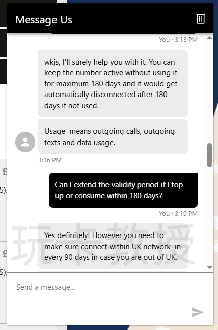 暂停后我们的可以按量(即付即用)继续使用VOXI服务(账户没有余额只能接收短信,无法用流量,发短信,打电话,根据自己需求进行充值),按量付费180天内余额需要发生变化,可充值(最低充值5英镑)可消费(0.24一条短信),否则会自动回收,注意:客服回复180天是指在英国的号码,90天需要连接到英国网络,这里可能需要使用英国IP全局,拉起WIFI Calling,然后在WIFI Calling下发送短信(目前我在安卓没有成功过拉起WIFI Calling)