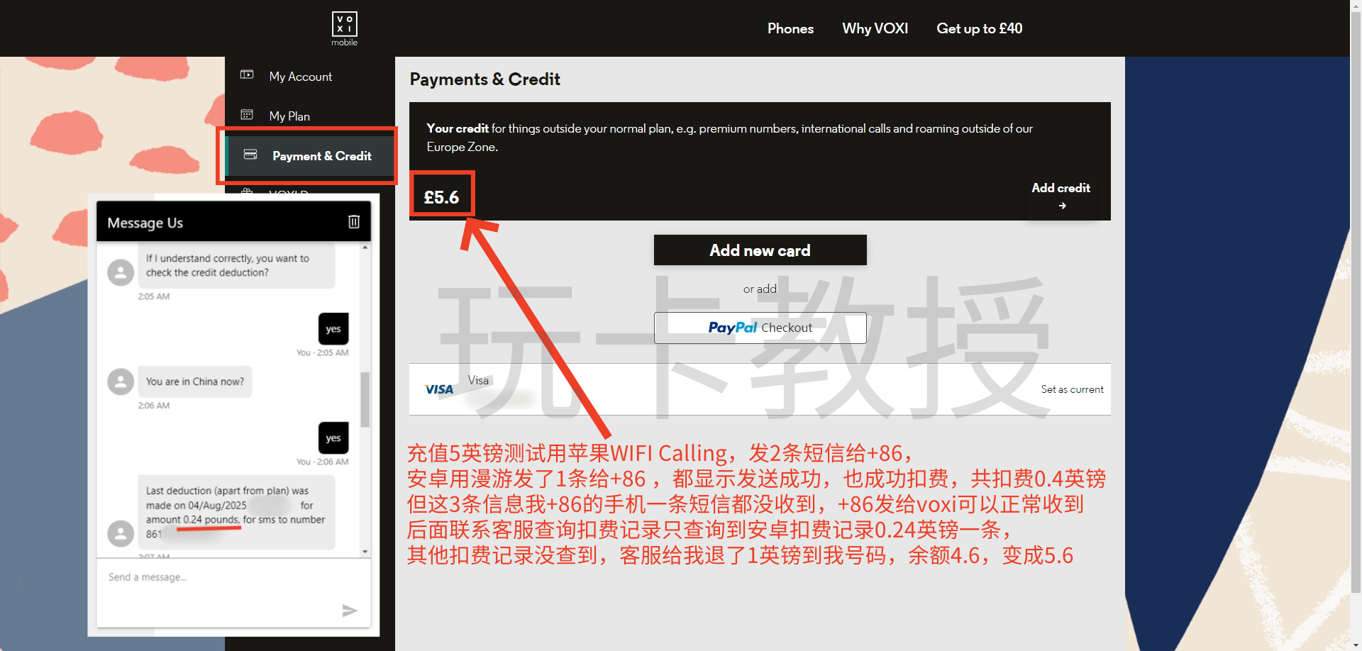 点击:Payment & Credit,可以查看号码的余额和充值,我这里充值5英镑测试用苹果WIFI Calling,发2条短信给+86,安卓用漫游发了1条给+86 ,都显示发送成功,也成功扣费,共扣费0.4英镑,但这3条信息我+86的手机一条短信都没收到,+86发给voxi可以正常收到