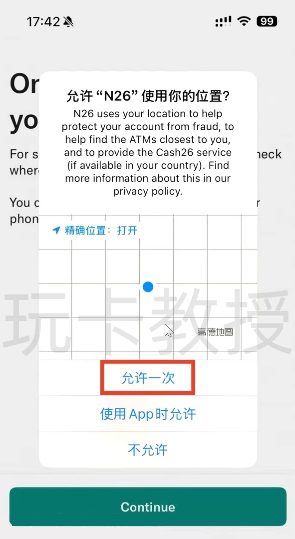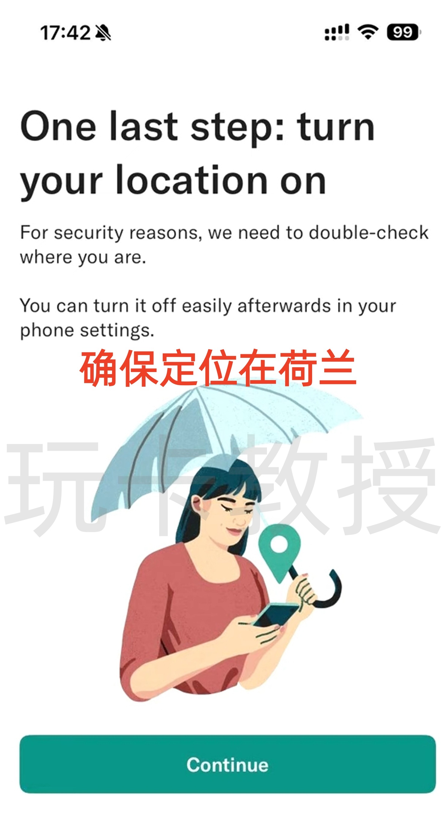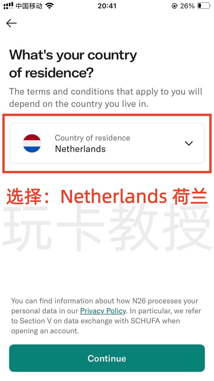 下载N26后,全局荷兰IP,打开N26,点击:Open an account,选择:Netherlands,点击:Continue
