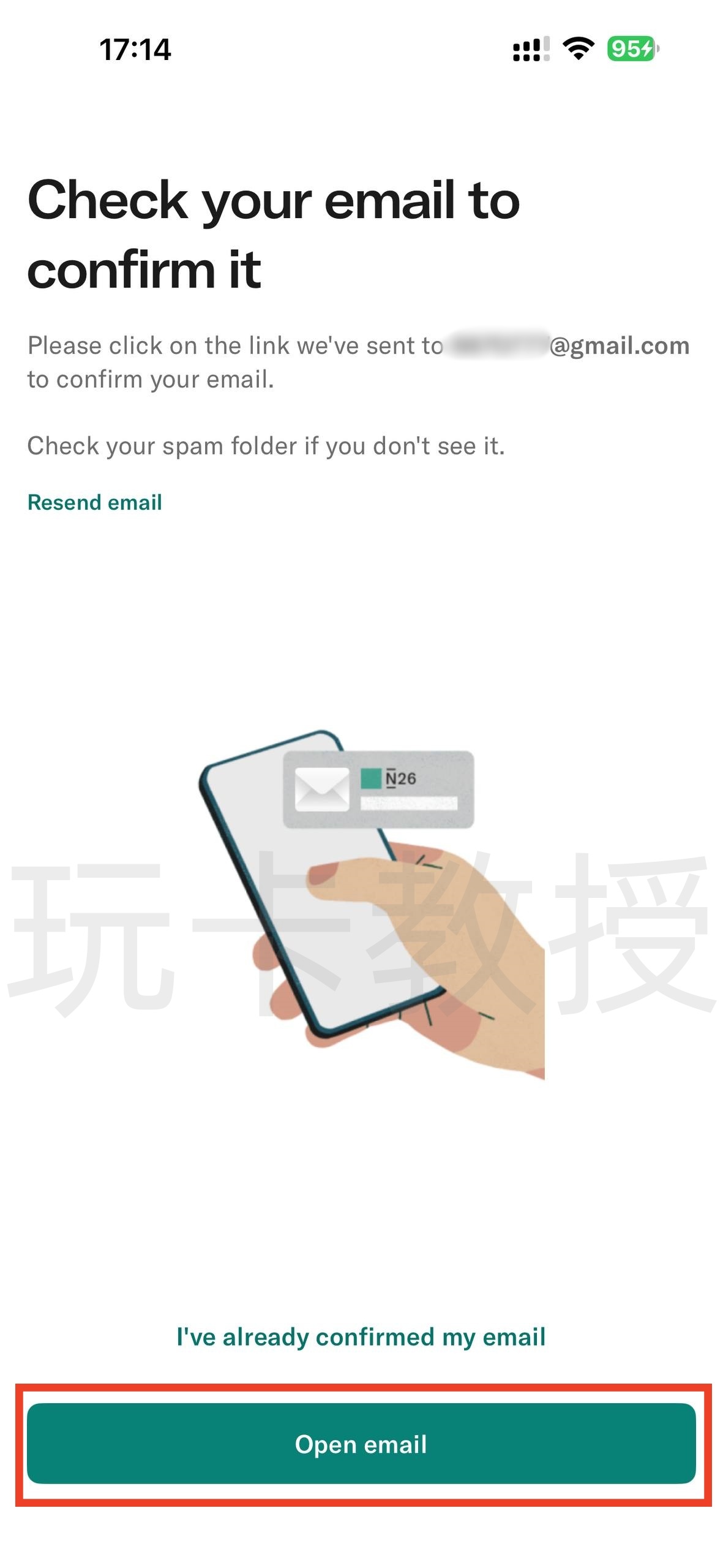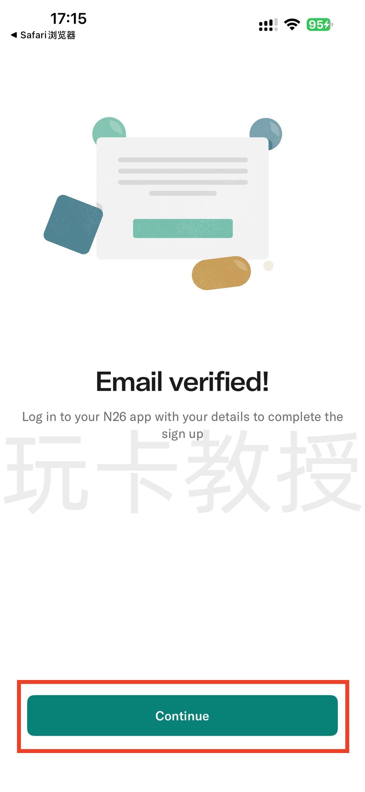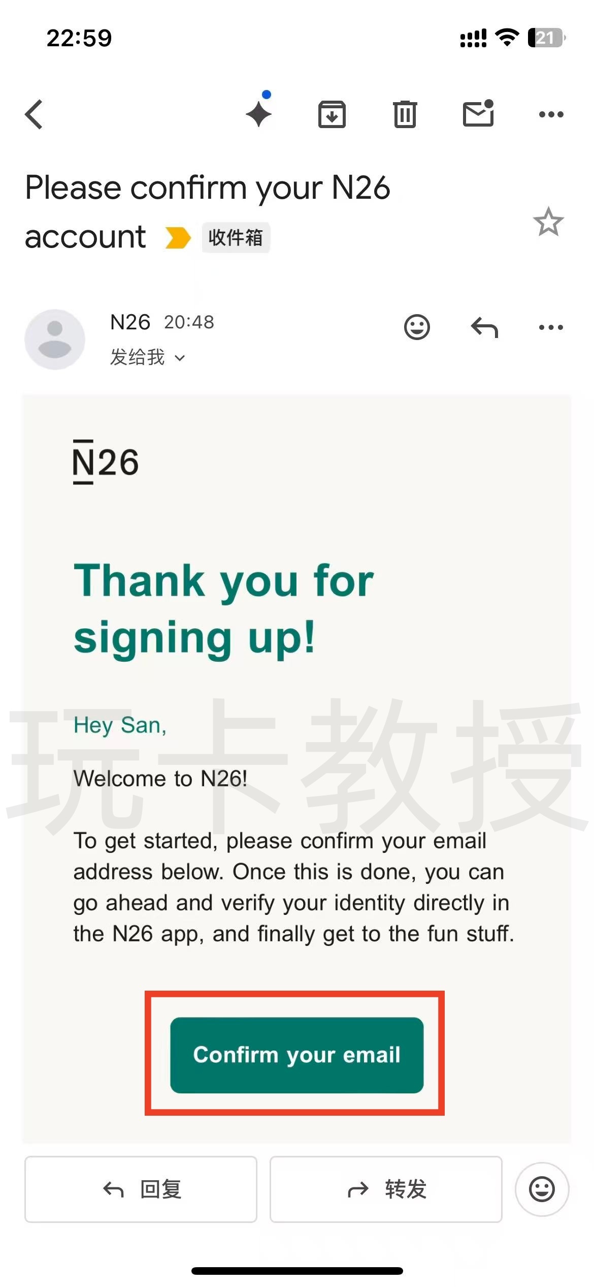N26会发一个邮件到你邮箱,打开邮件,点击:Confirm your email,验证邮箱,验证完成后,点击:Continue