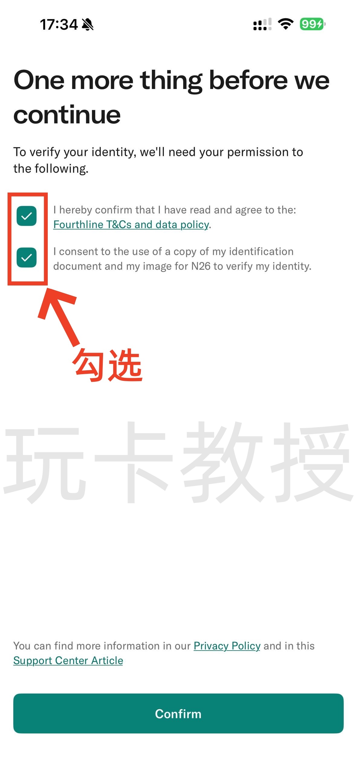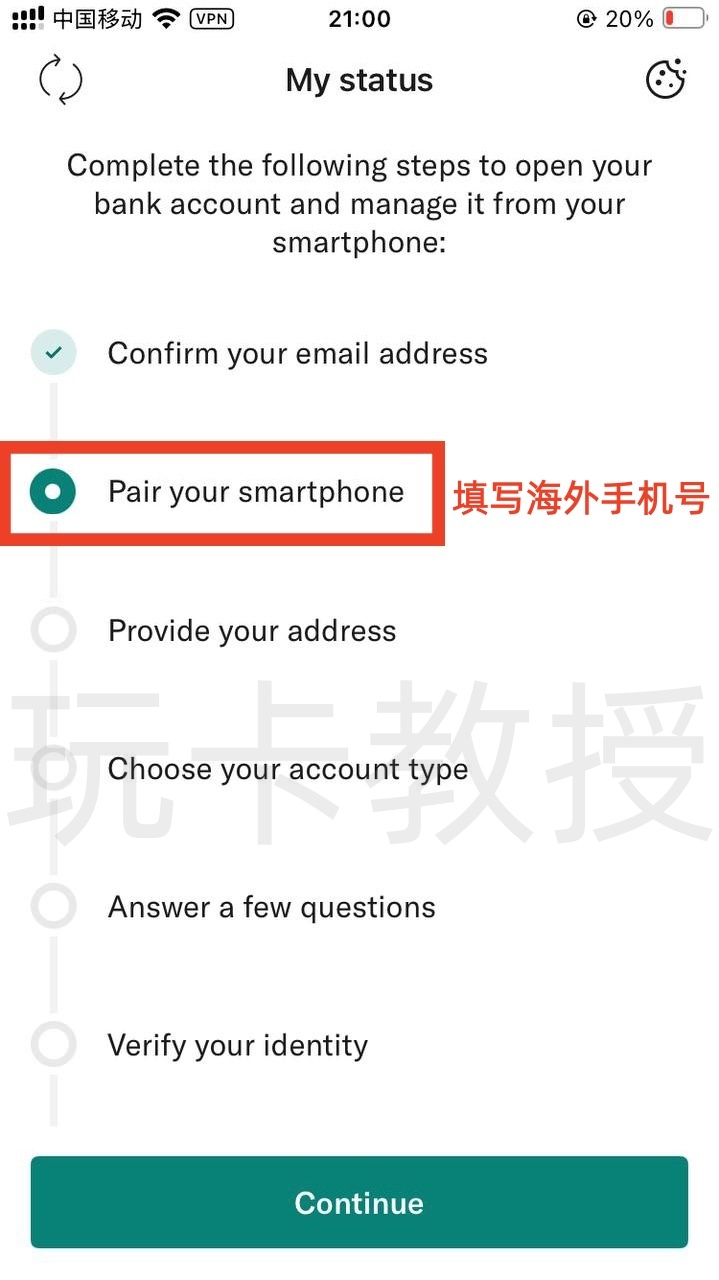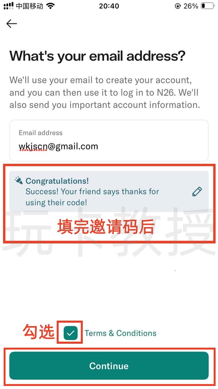 N26会发一个邮件到你邮箱,打开邮件,点击:Confirm your email,验证邮箱,验证完成后,点击:Continue