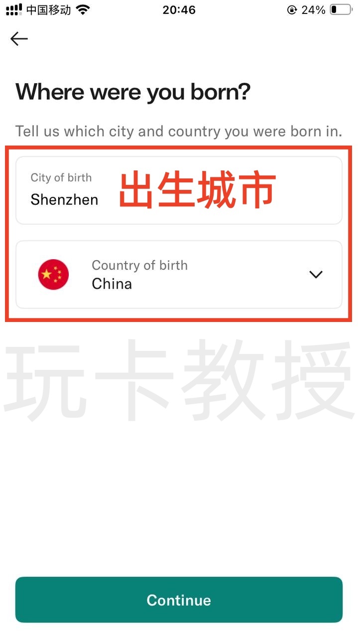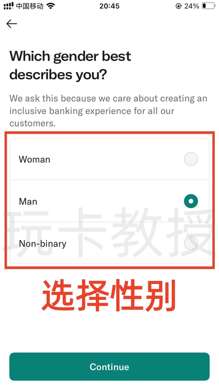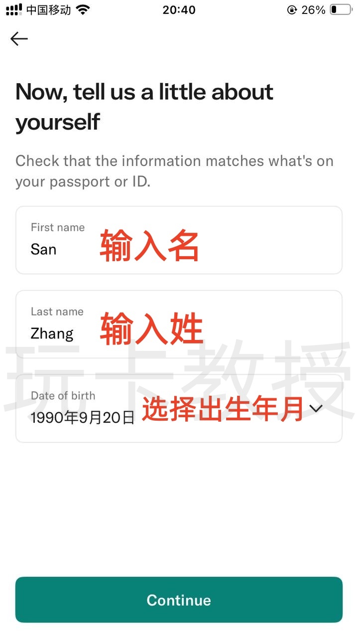 勾选:Terms & Conditions,点击:Continue,输入姓和名,出生年月,点击:Continue,选择性别,点击:Continue