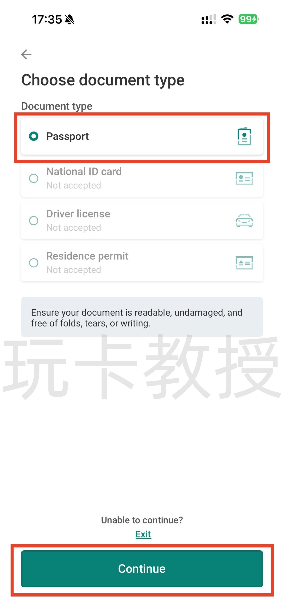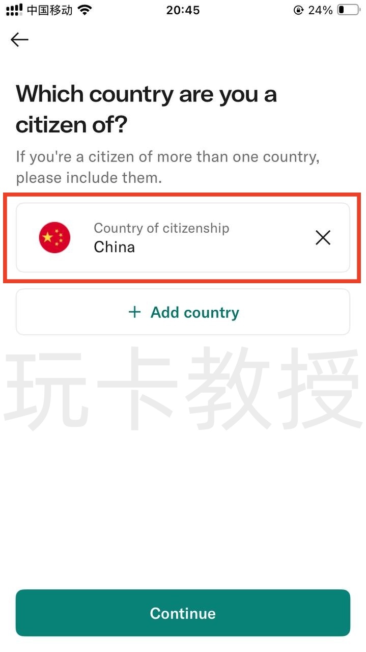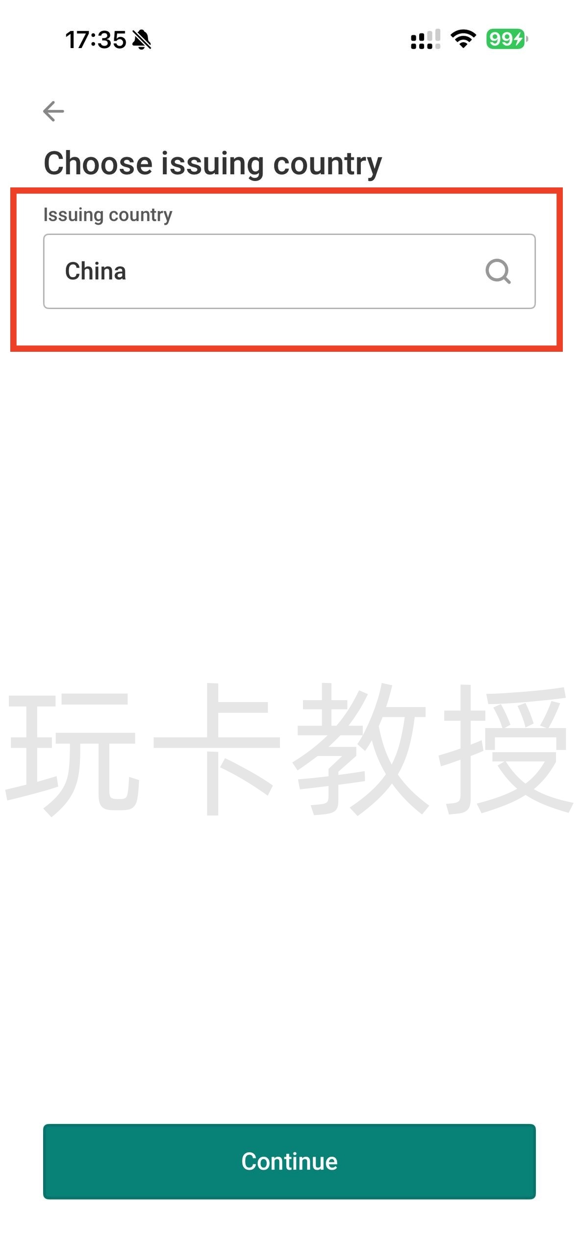 lssuing country:选择China,Document type:选择Passport,点击:Continue