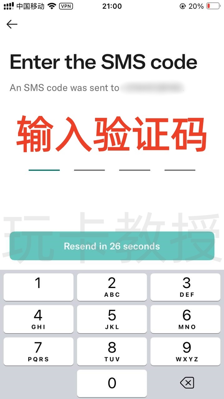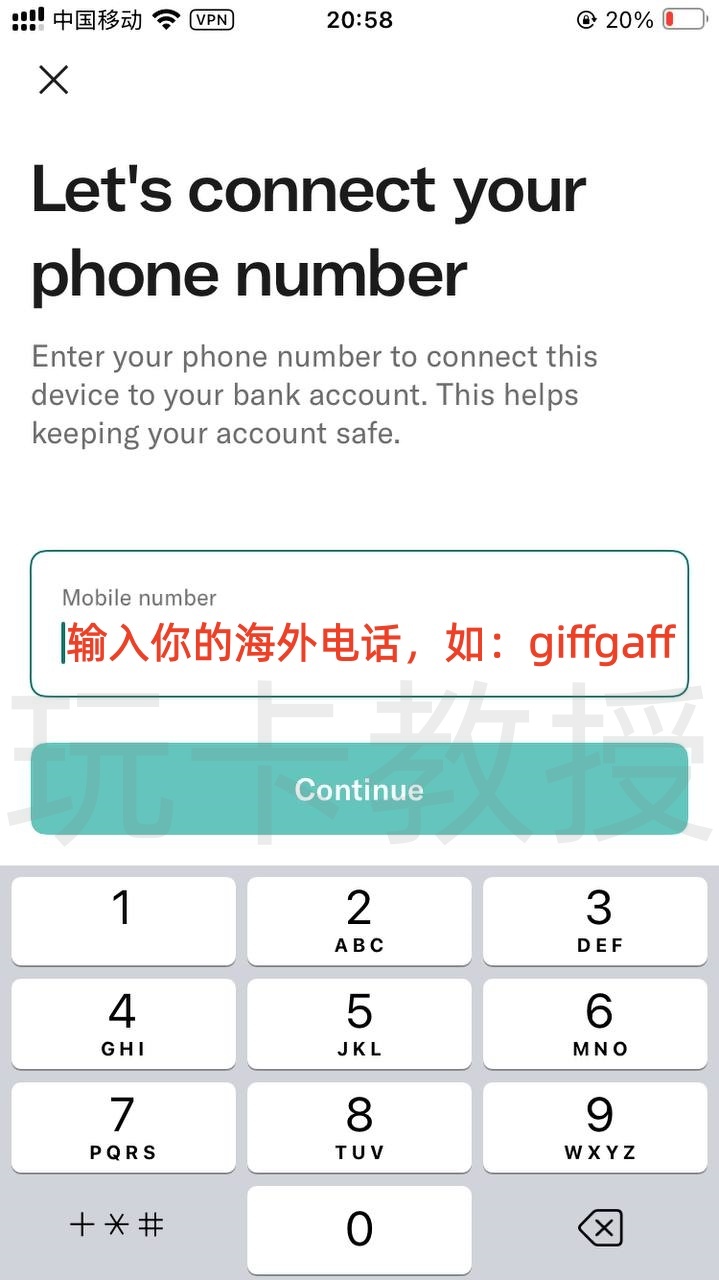 接下来填写您的海外手机号码,输入你海外的手机号码,如giffgaff,输入获取到的验证码进行验证