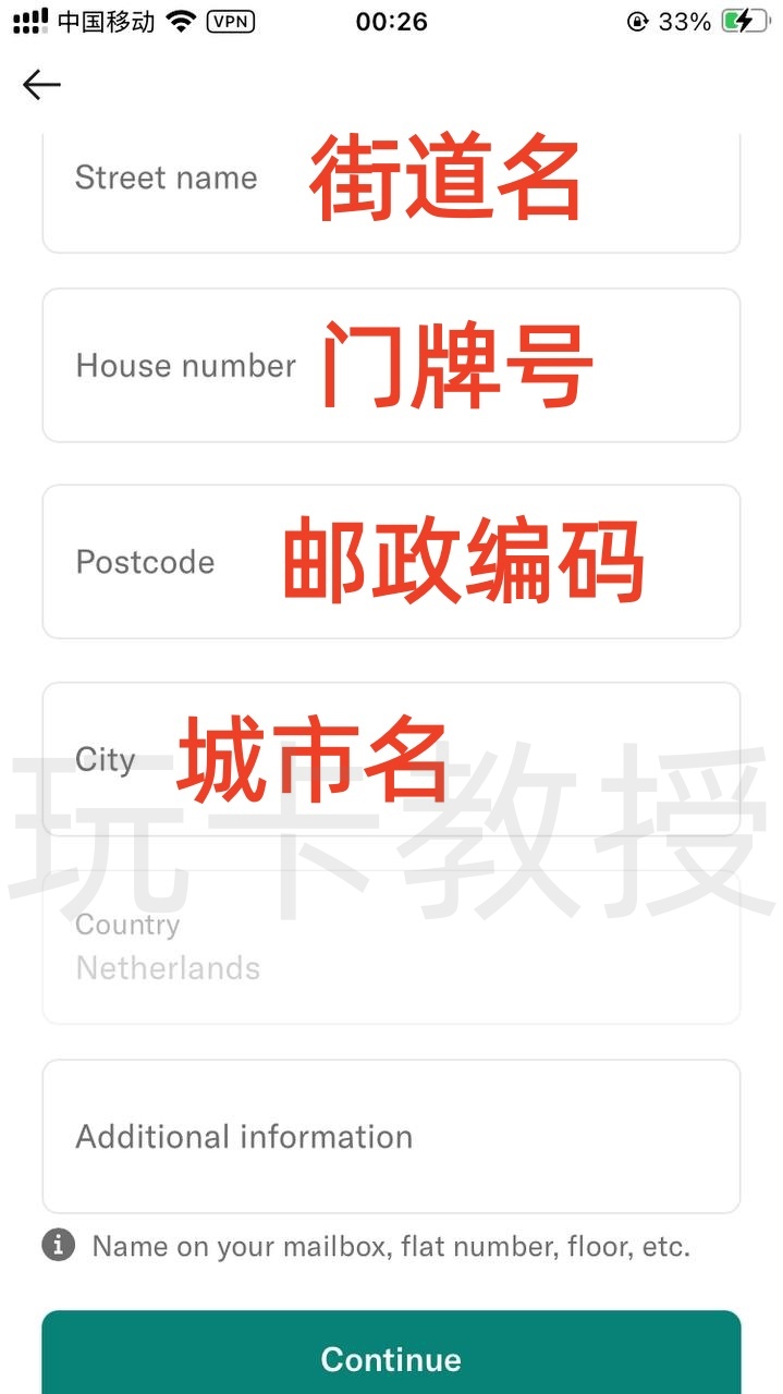 接下来填写您的荷兰的住宅地址,输入荷兰地址的城市名,邮政编码,门牌号,街道名, 点击:Continue
