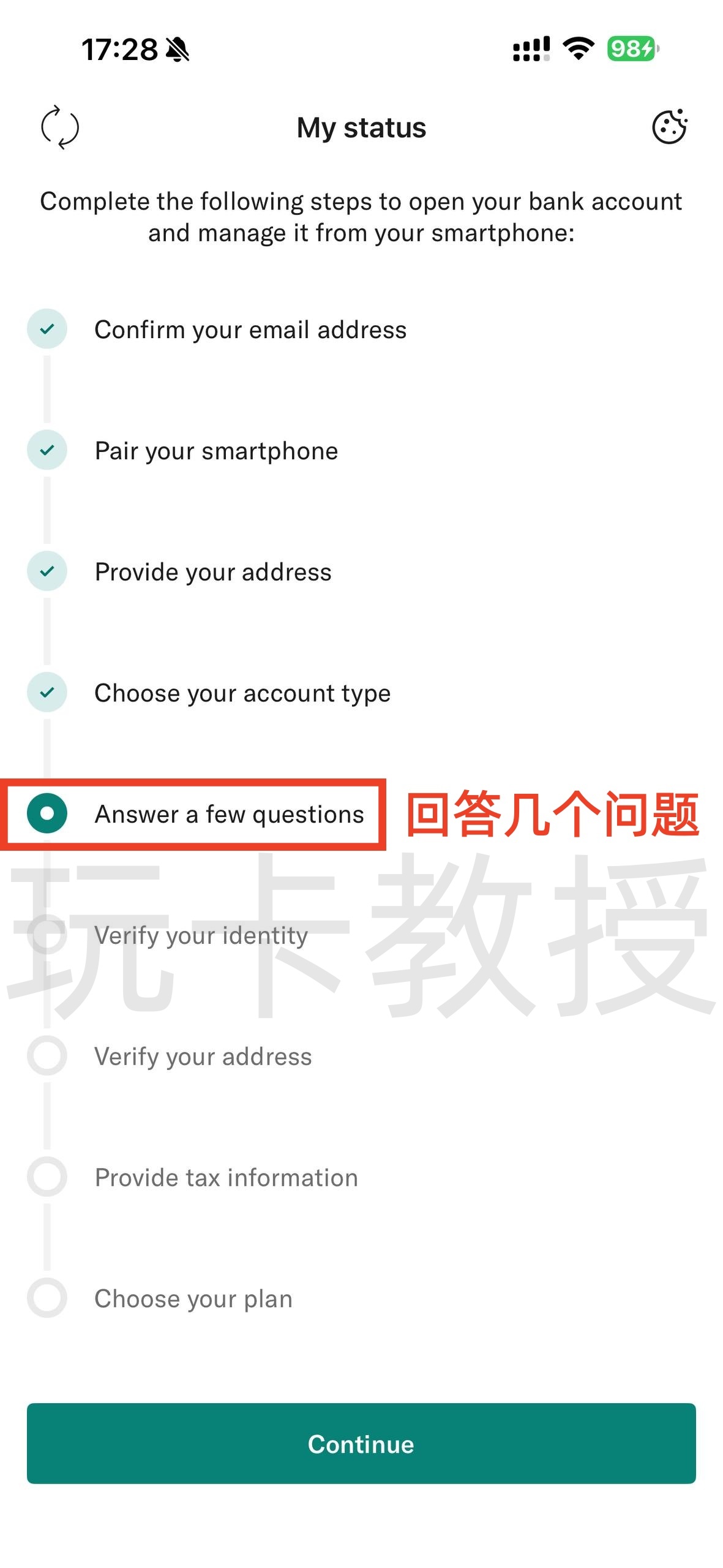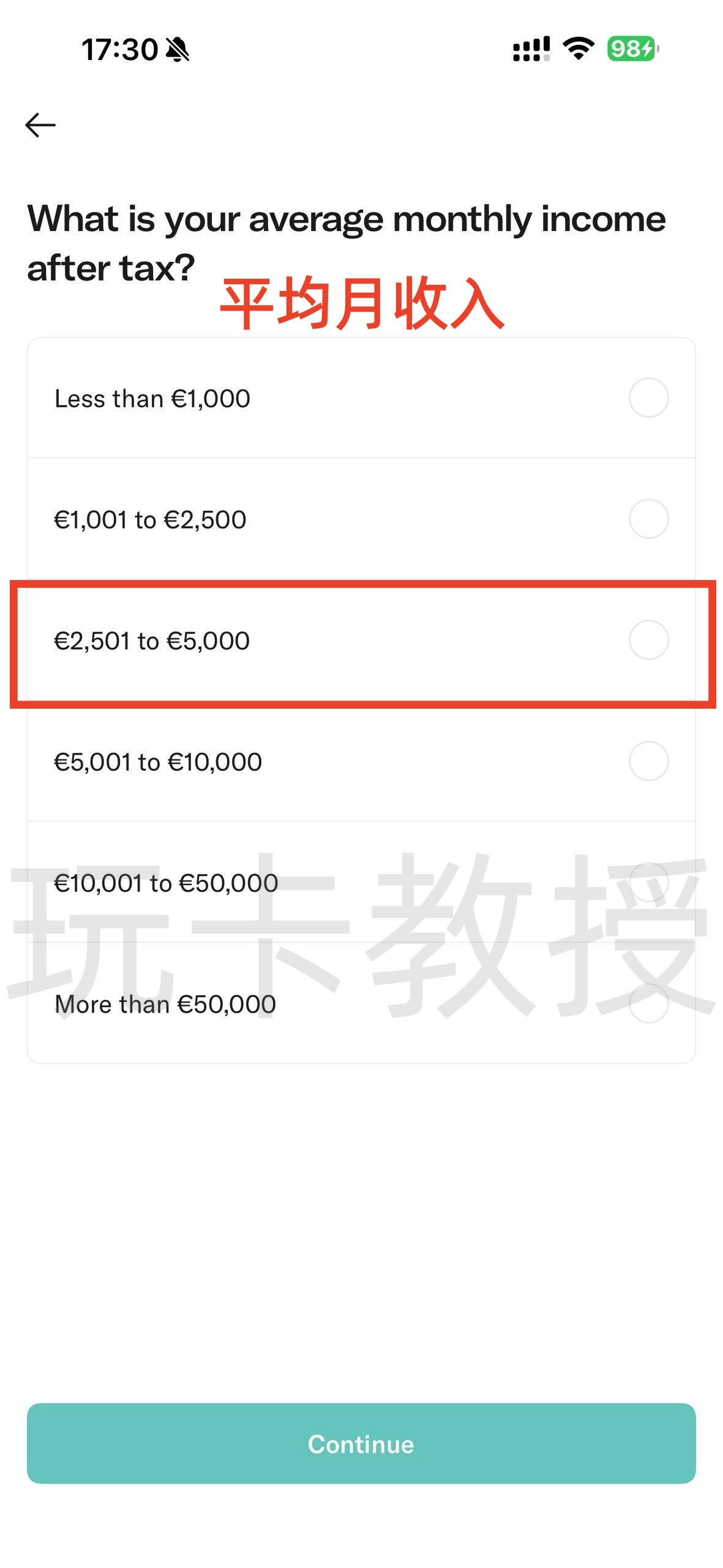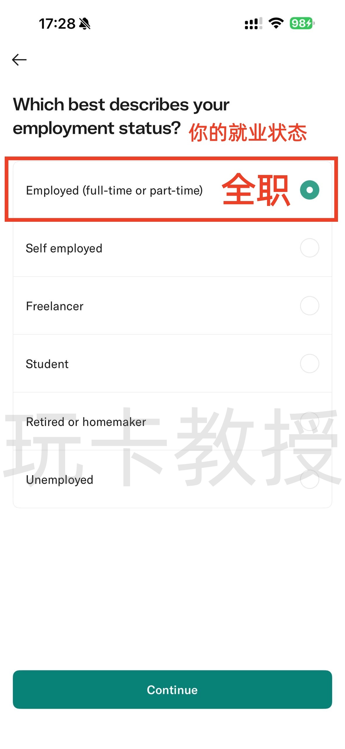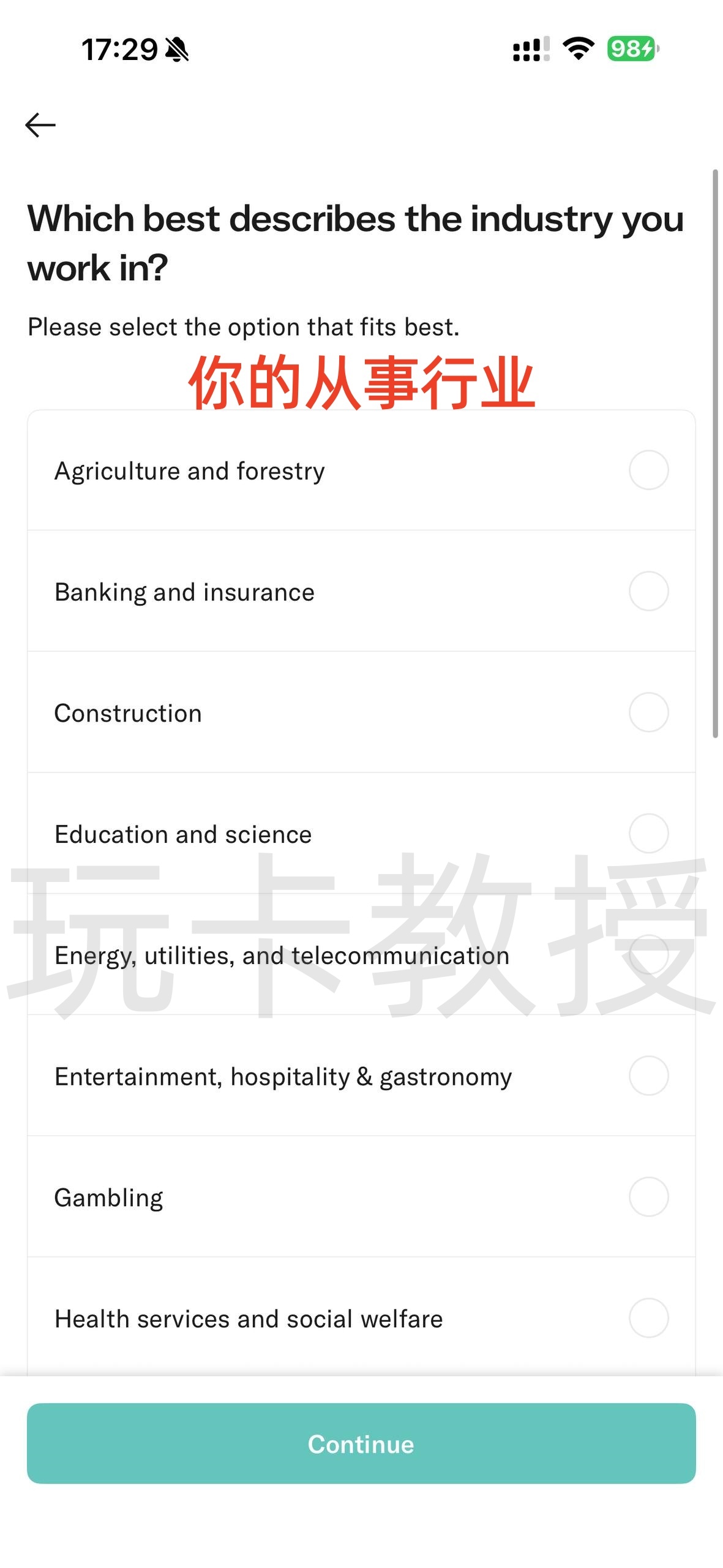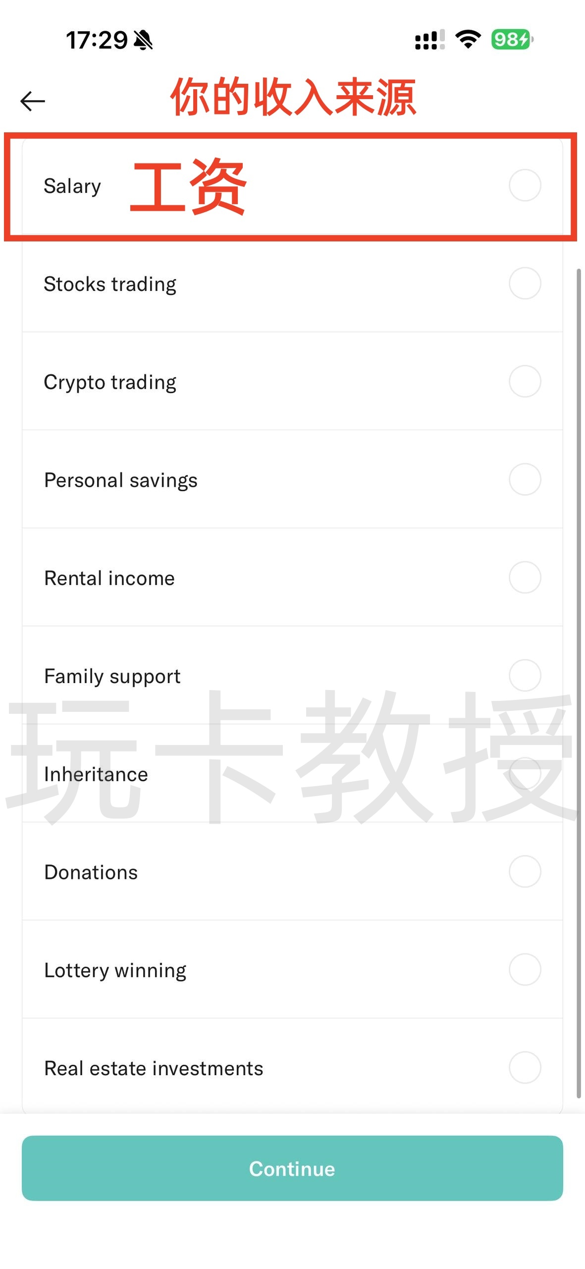 从事行业:根据你实际情况选择,收入来源:Salary(工资),平均月收入:选择中位数即可,点击:Continue