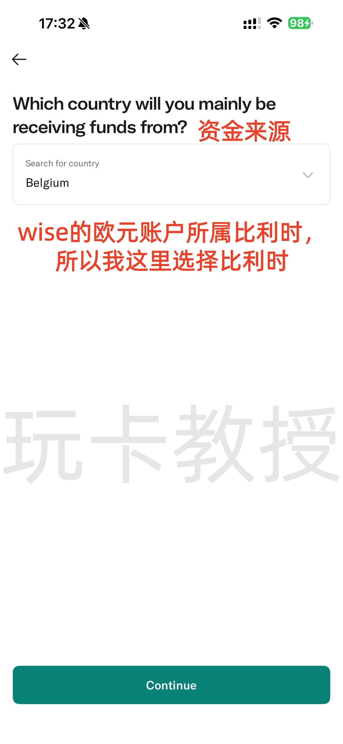 资金来源:如常用wise欧元账户入金,我们选择:Belgium(比利时),点击:Continue