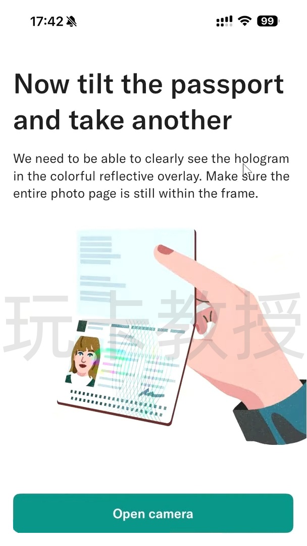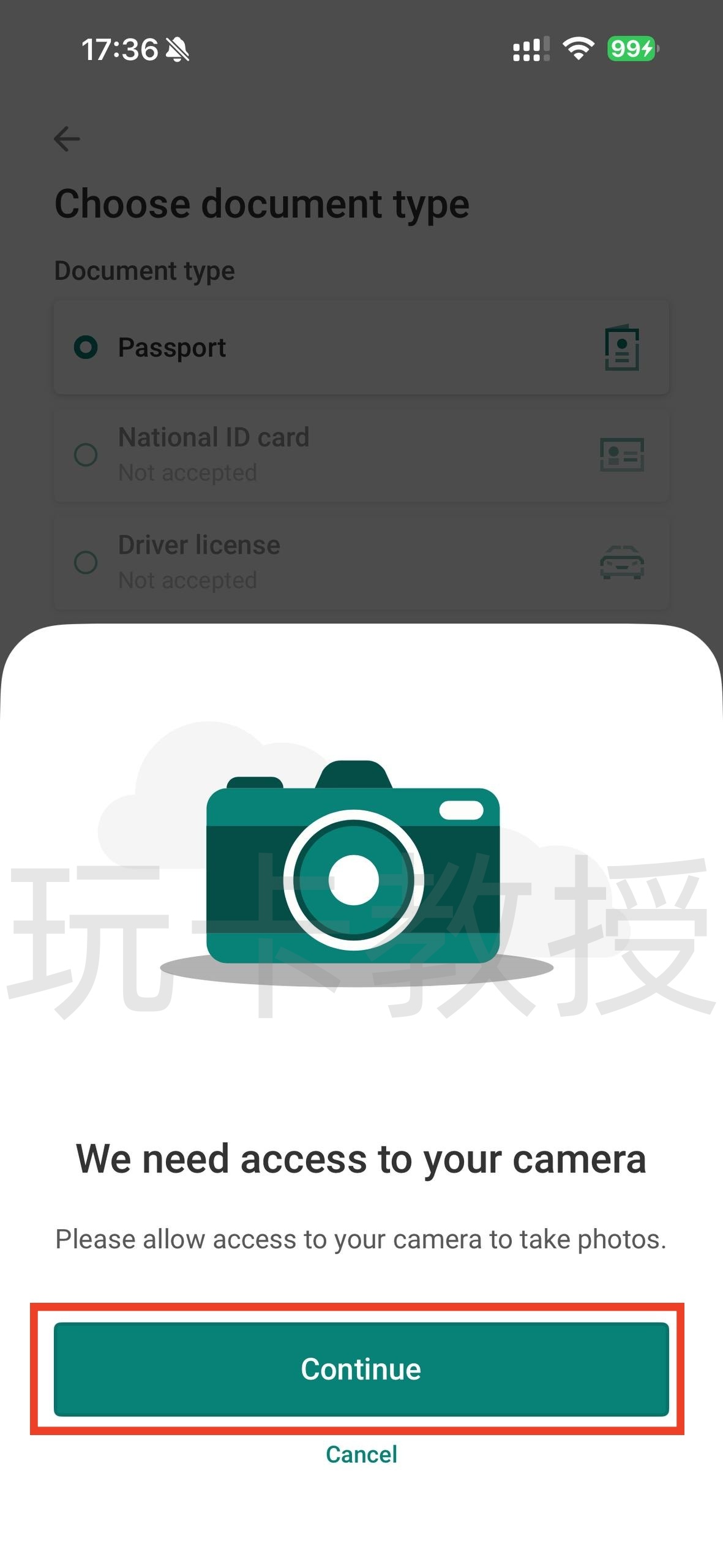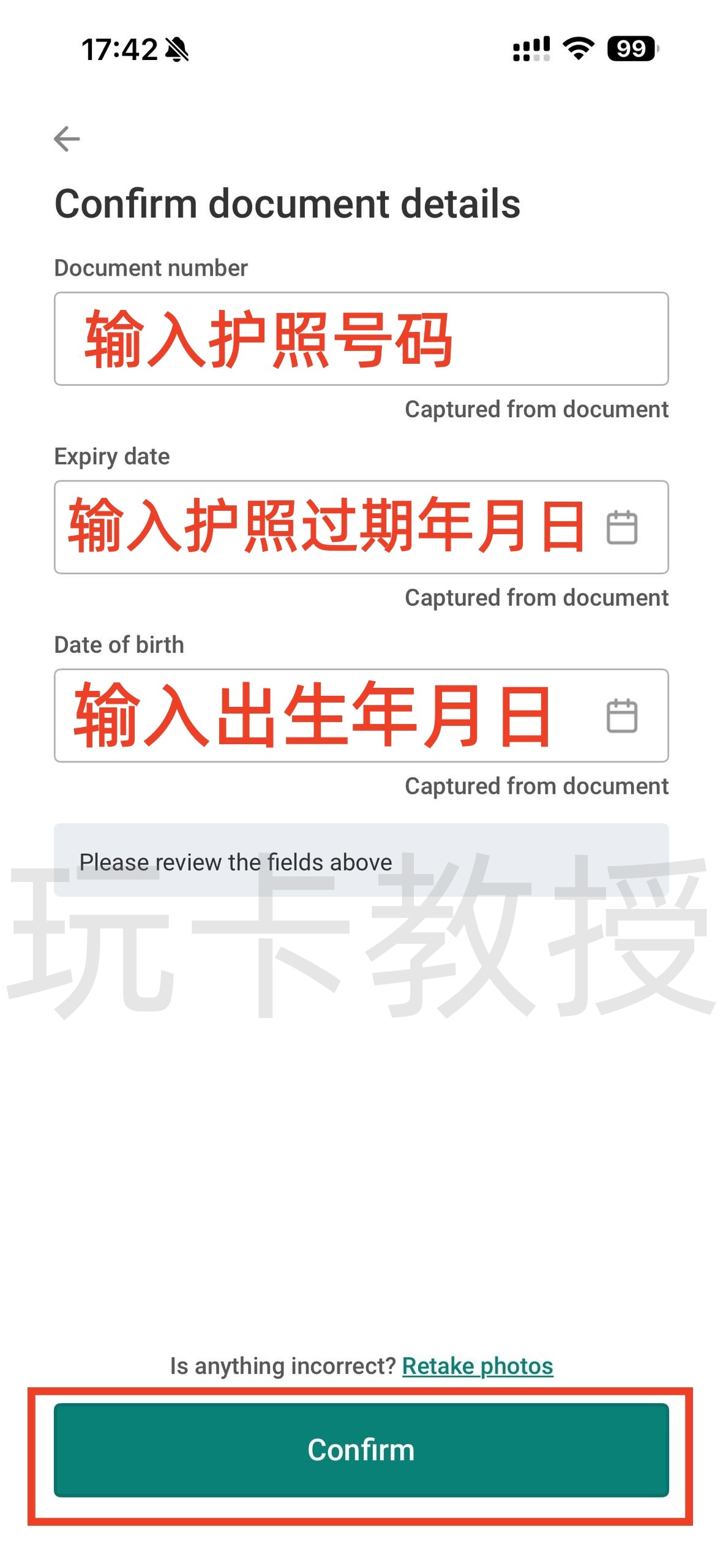 点击:Continue,拍摄护照信息页,拍摄护照侧面,输入护照号码,护照到期日,出生年月,点击:Confirm