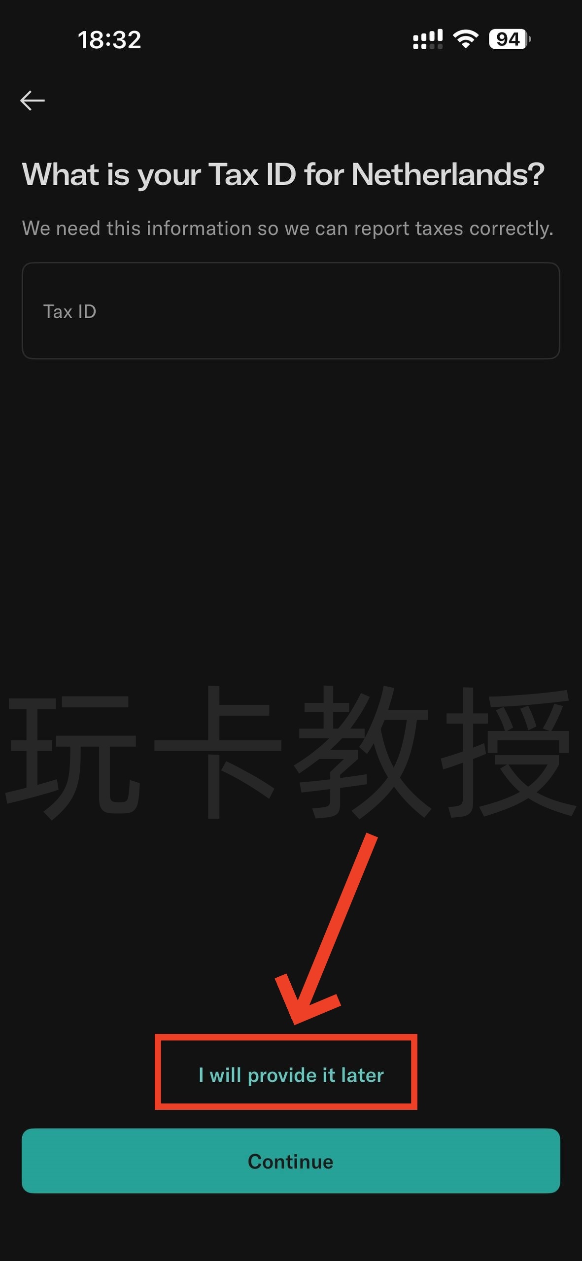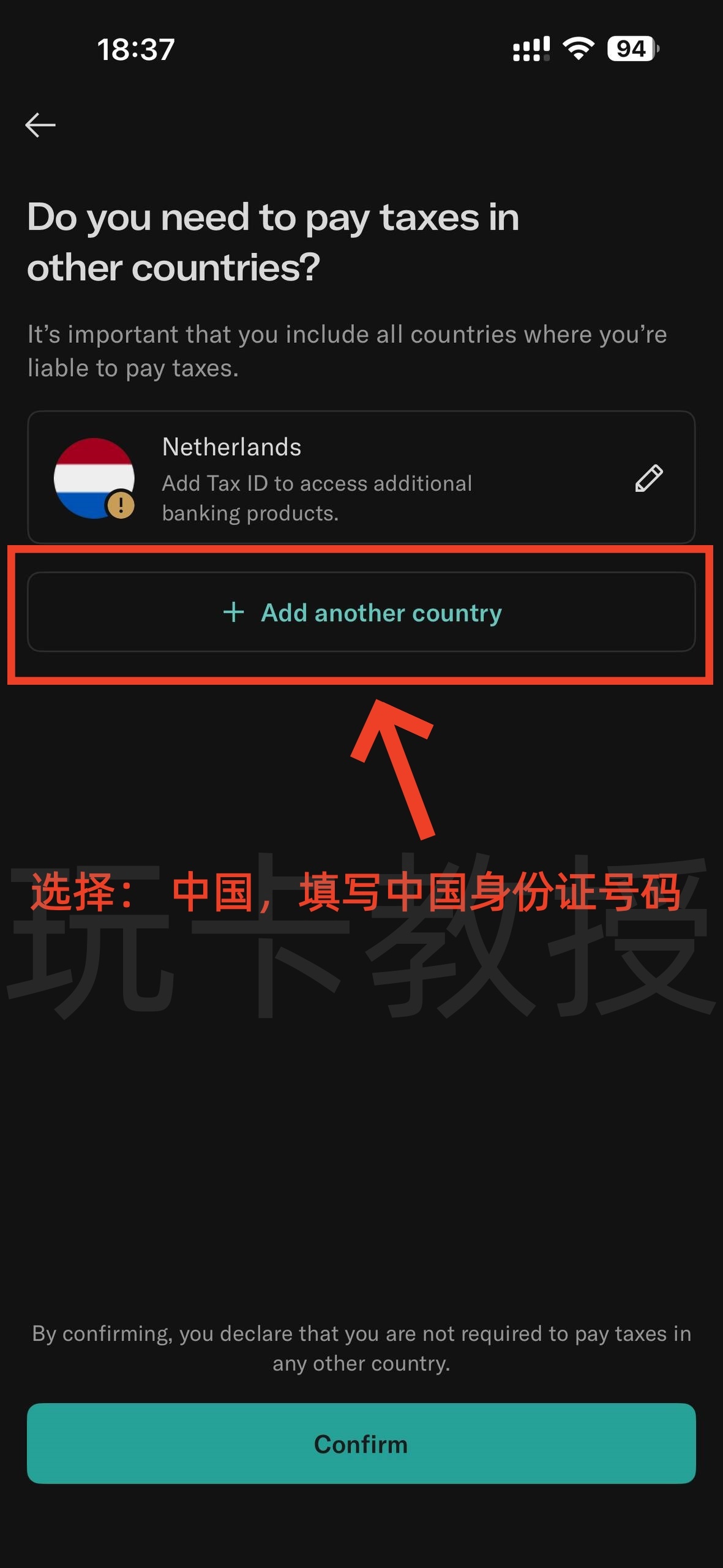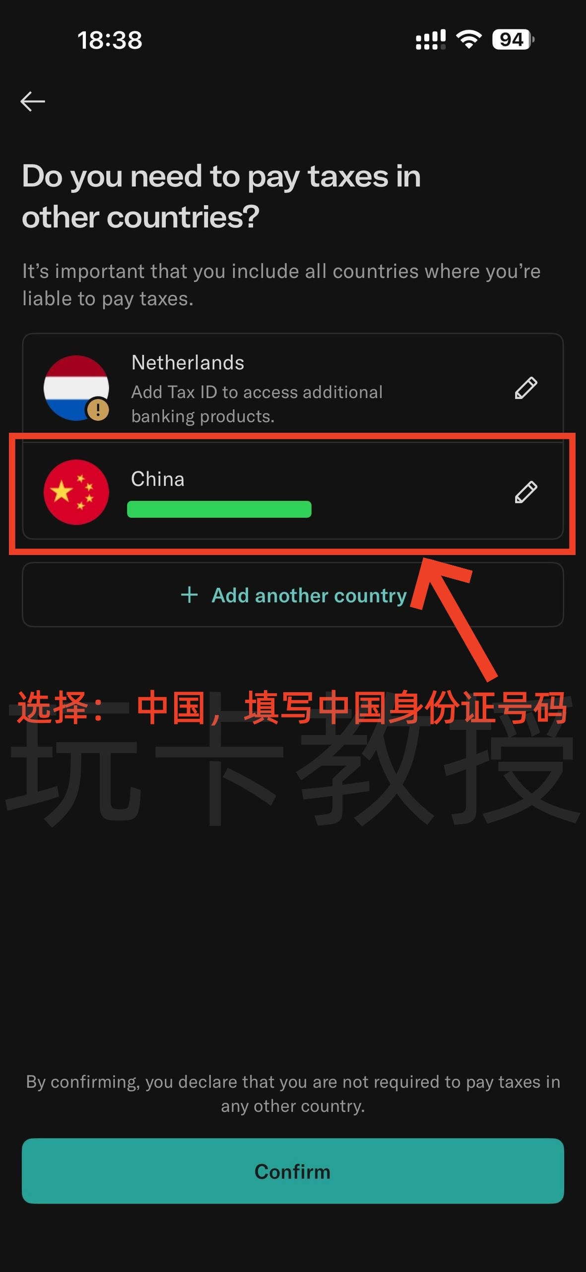 这里需要填写荷兰的税号,我们I will provide it later,点击:Add another country,选择中国,填写中国的身份号码,点击:Confirm
