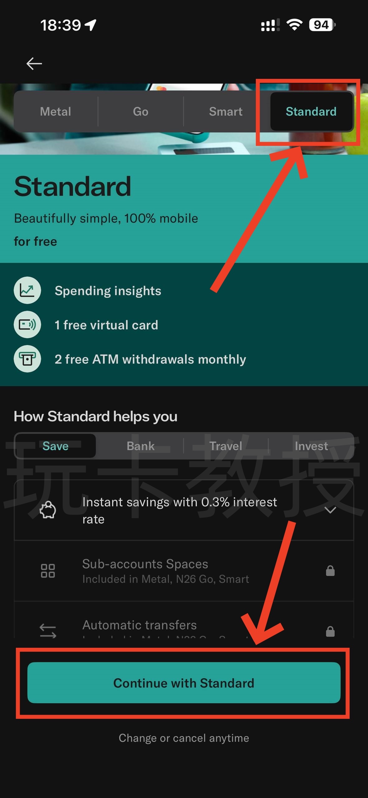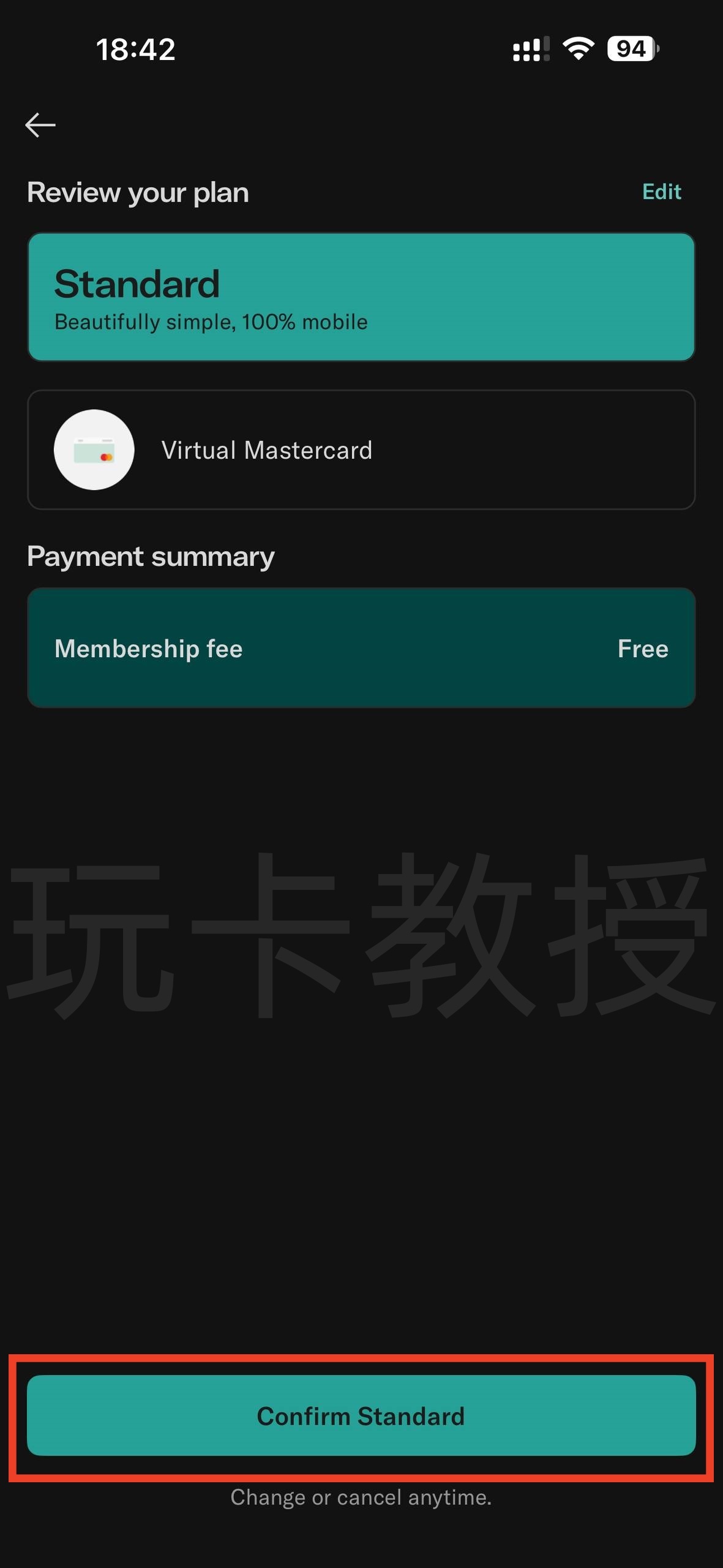 往下拉,点击:Continue with Standard,看到这里他会给我们一张免费的虚拟卡,点击:Confirm Standard