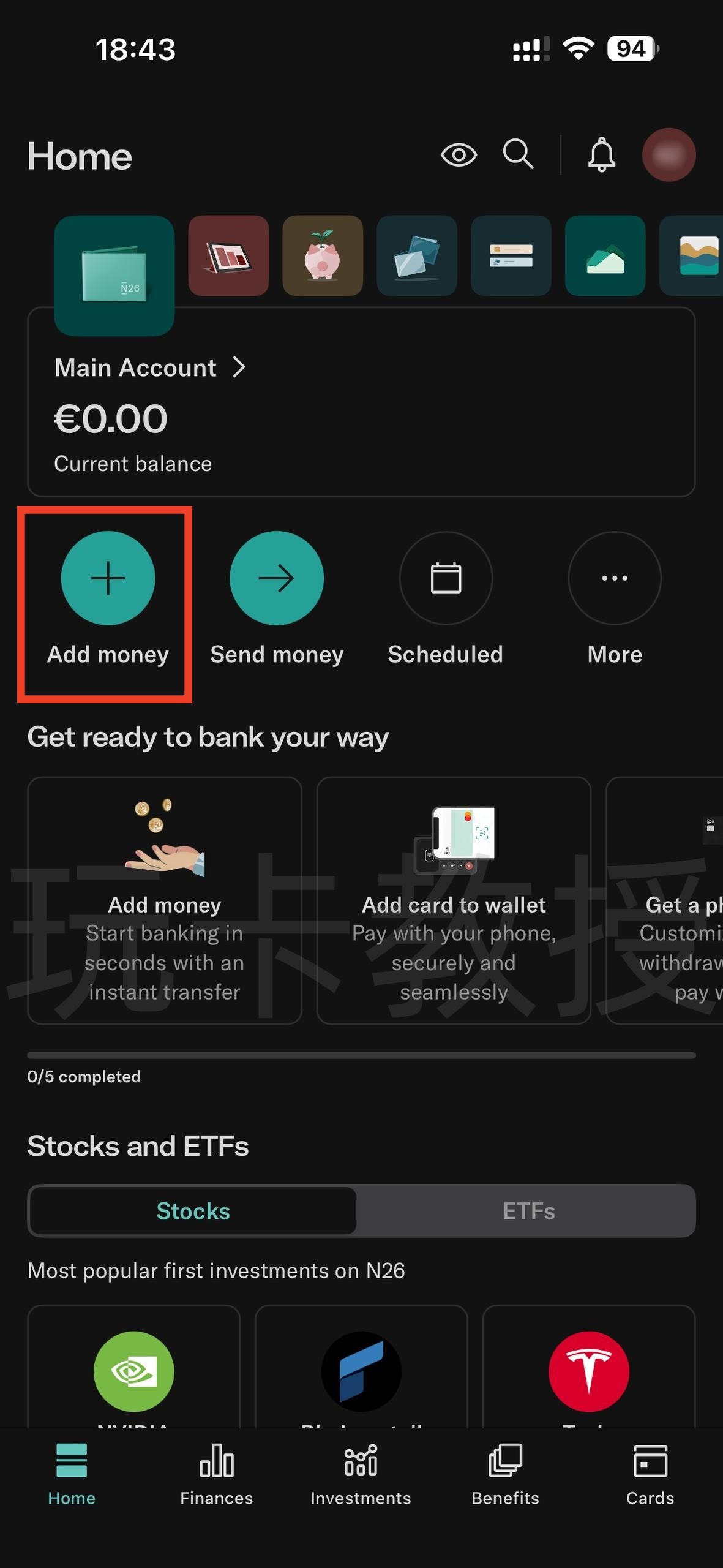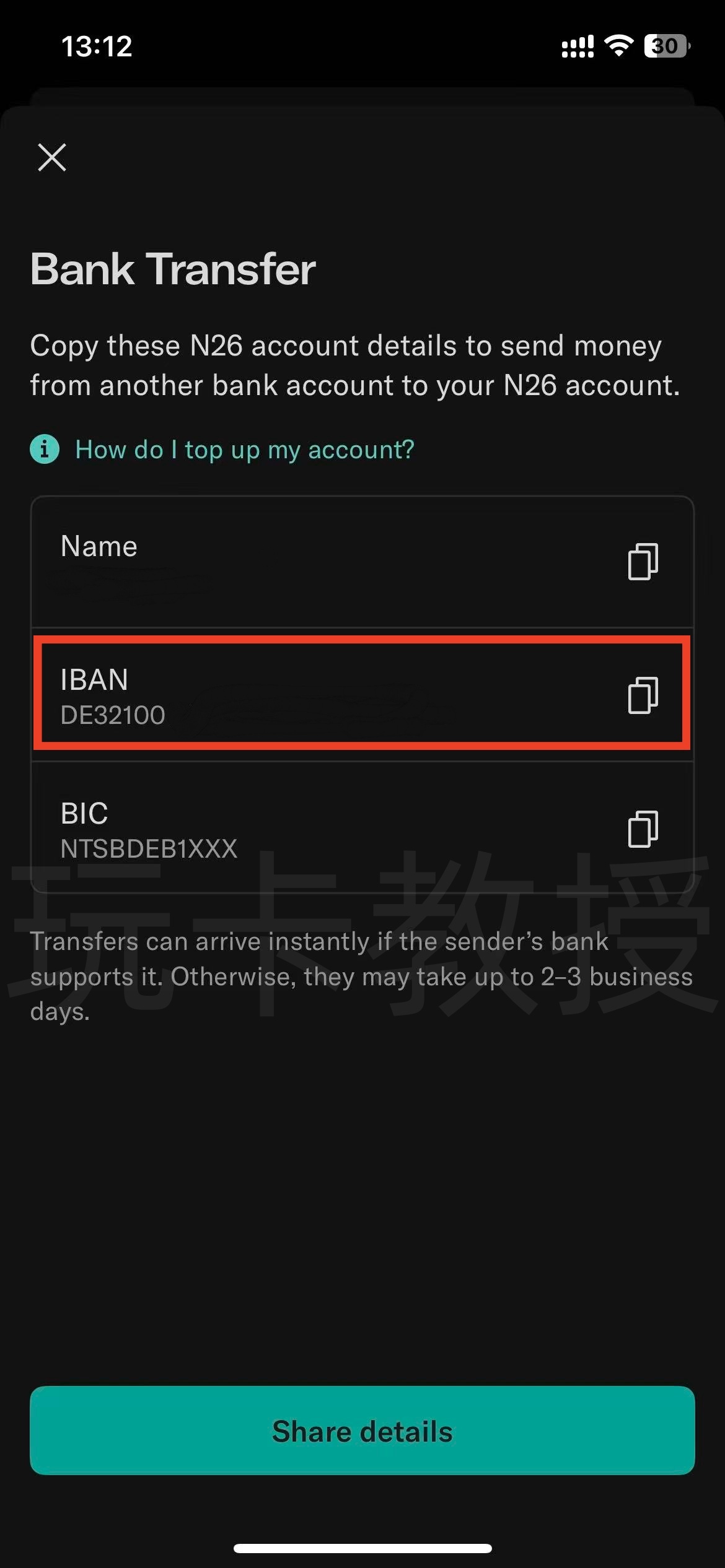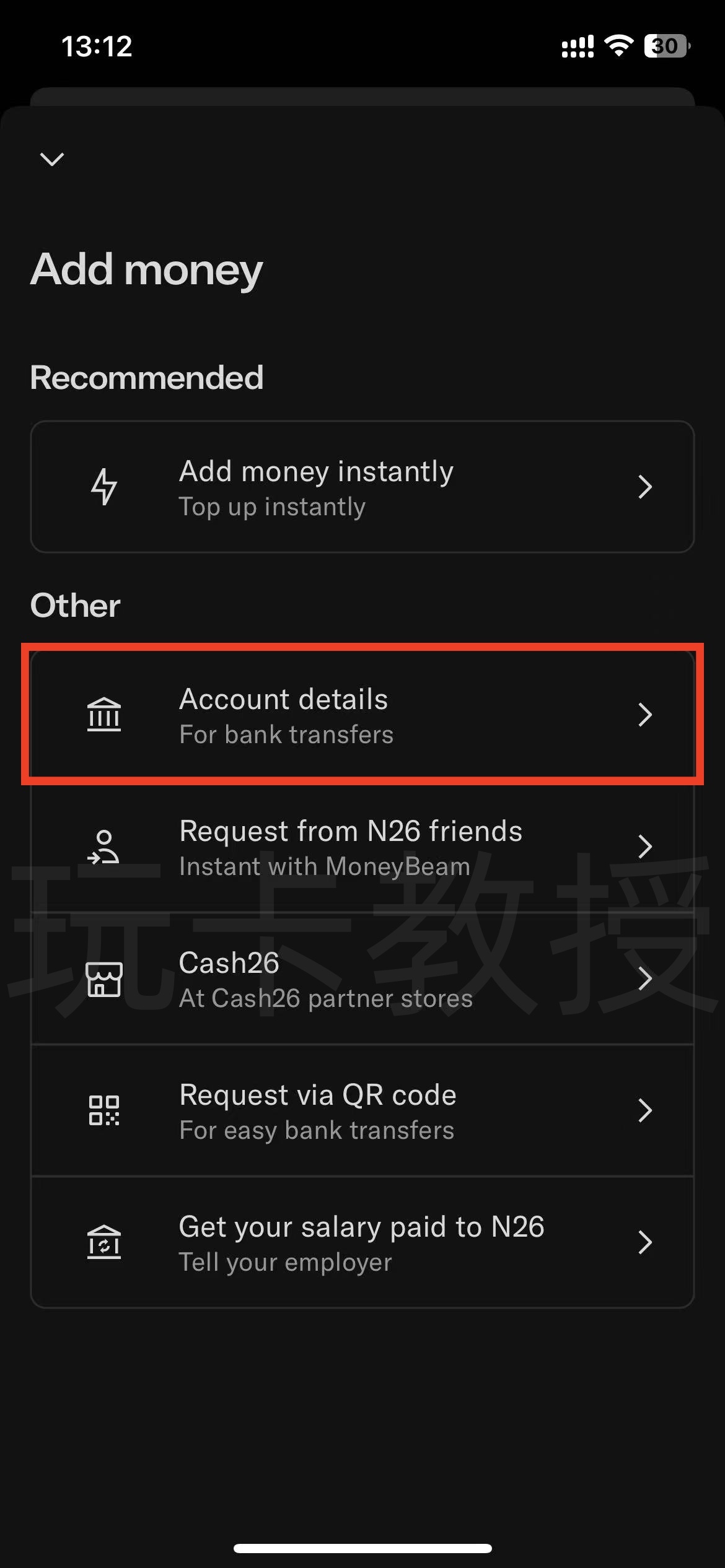 点击:Add money,点击:Account details,就可以看到我们的IBAN,我们通过Wise转10欧元到N26进行激活