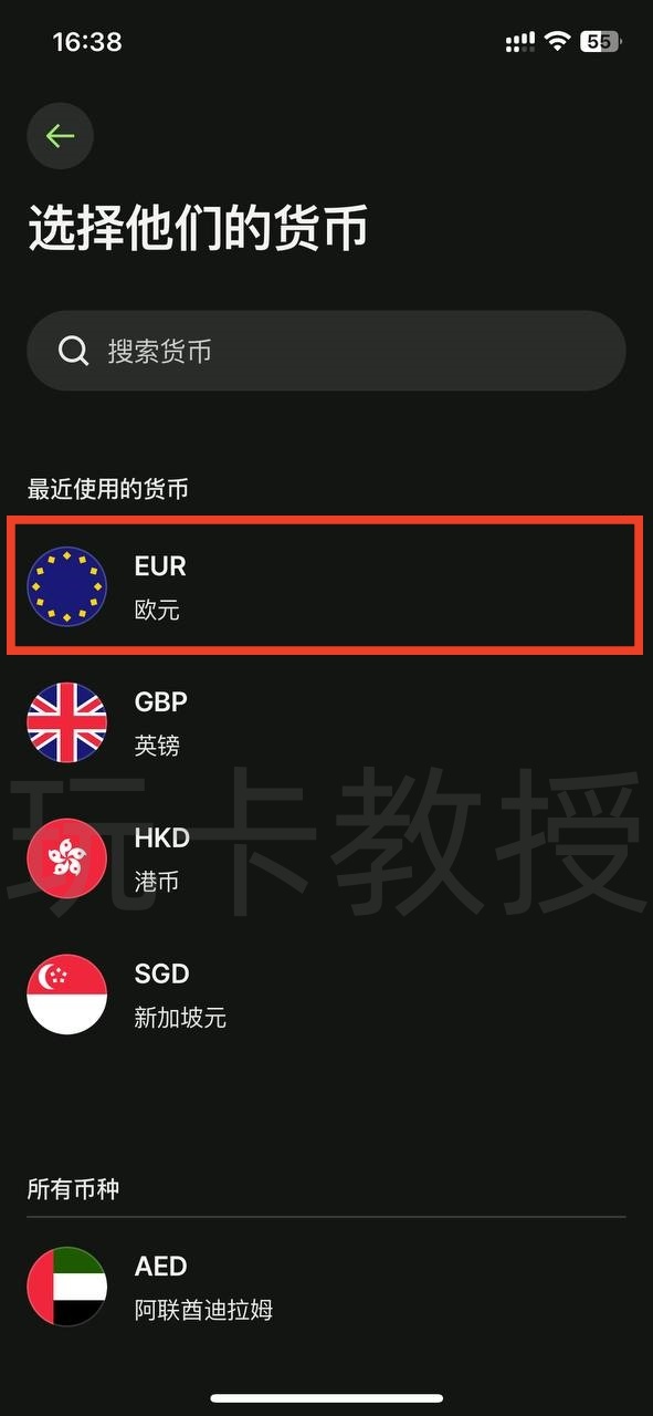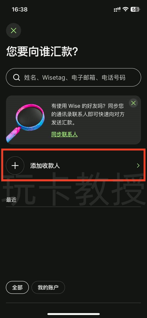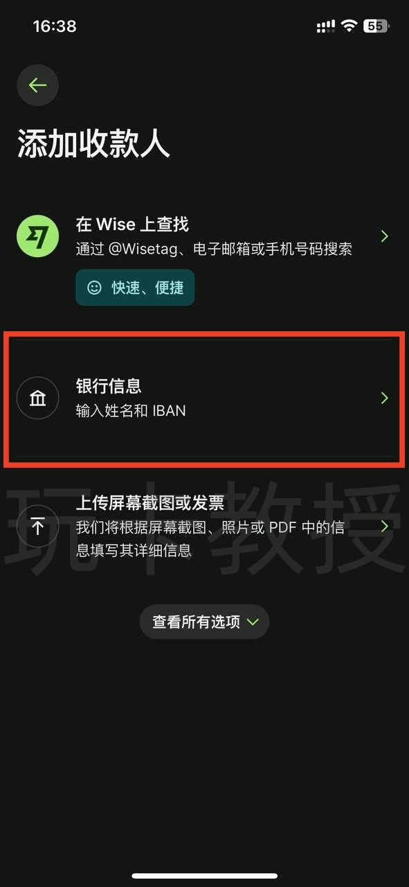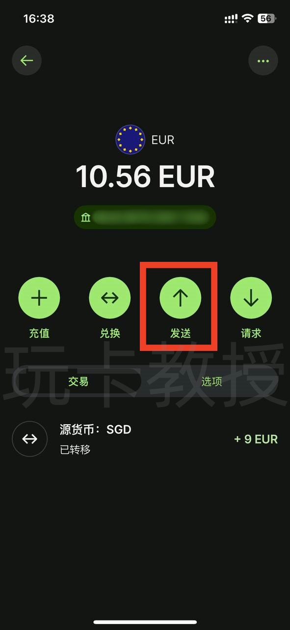打开wise,点击欧元余额,点击:发送,点击:添加收款人,选择EUR(欧元)