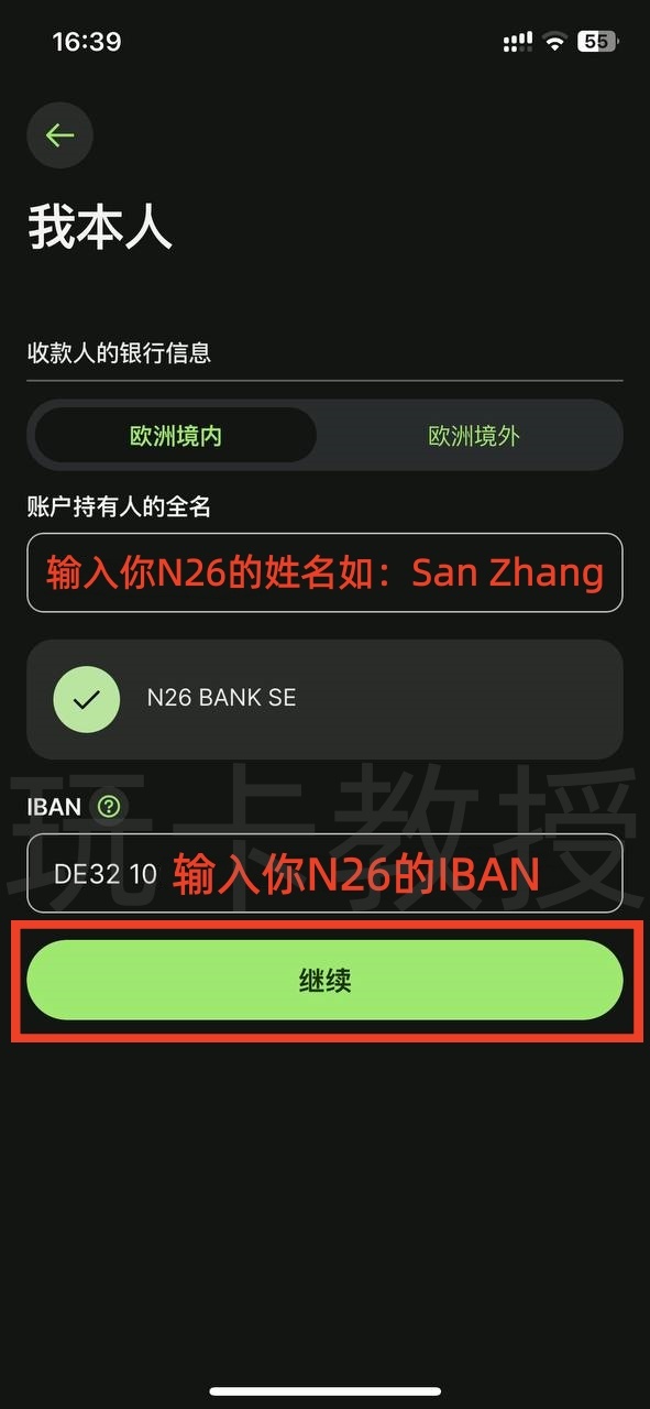 选择:IBAN,选择:我本人,选择:填写你N26的姓名(名在前,姓在后)N26的IBAN,会自动识别出来N26,点击:继续