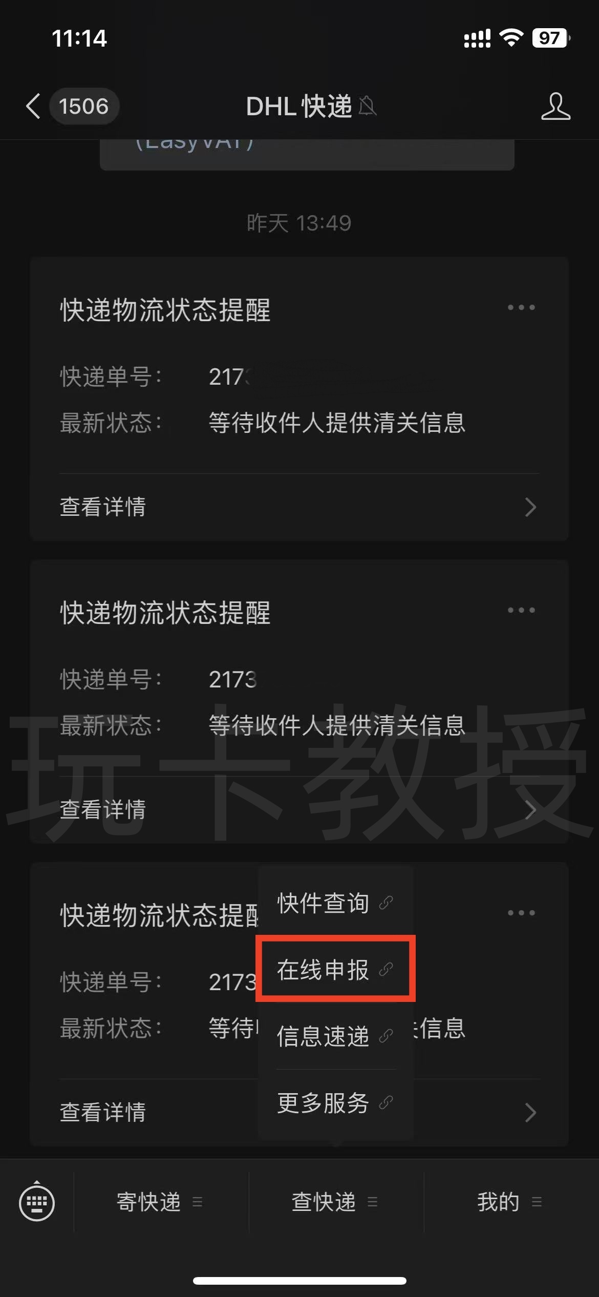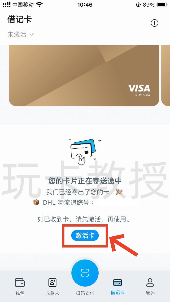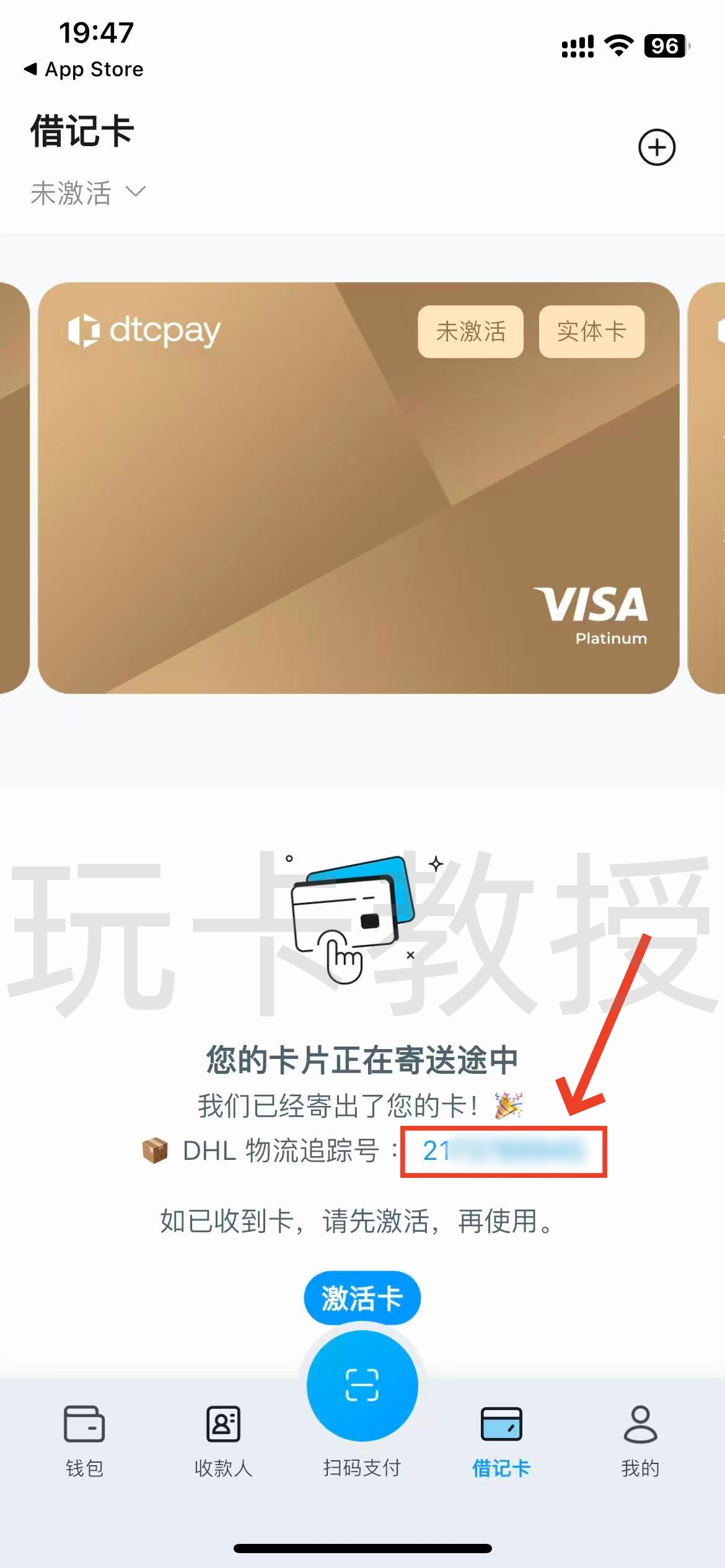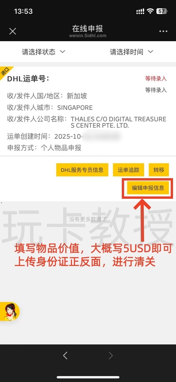 就看到,卡片等待寄出(物流到达中国后,请到DHL微信公众号进行在线申报,进行清关,否则会被退回)