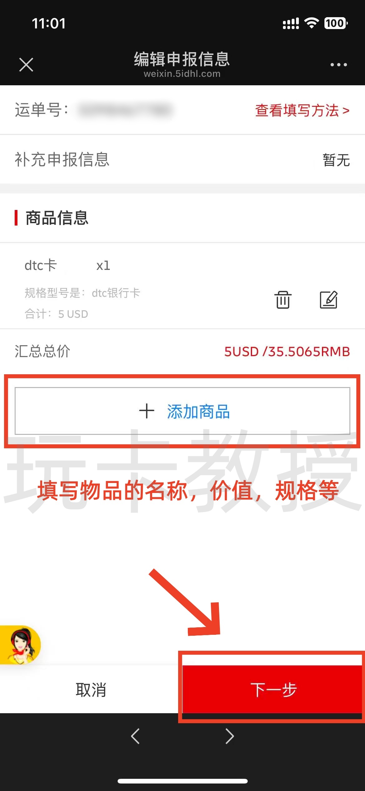 点击:编辑申报信息,添加物品名称,价值,规格等,上传身份证正反面