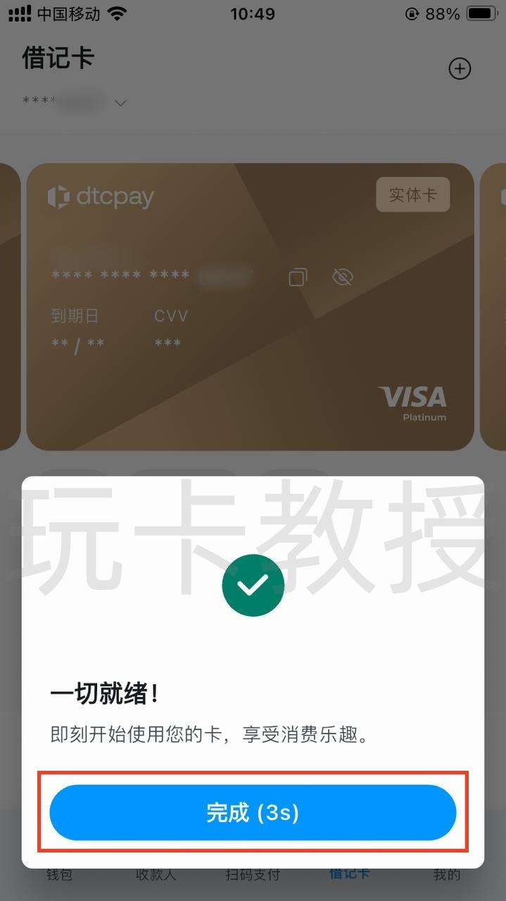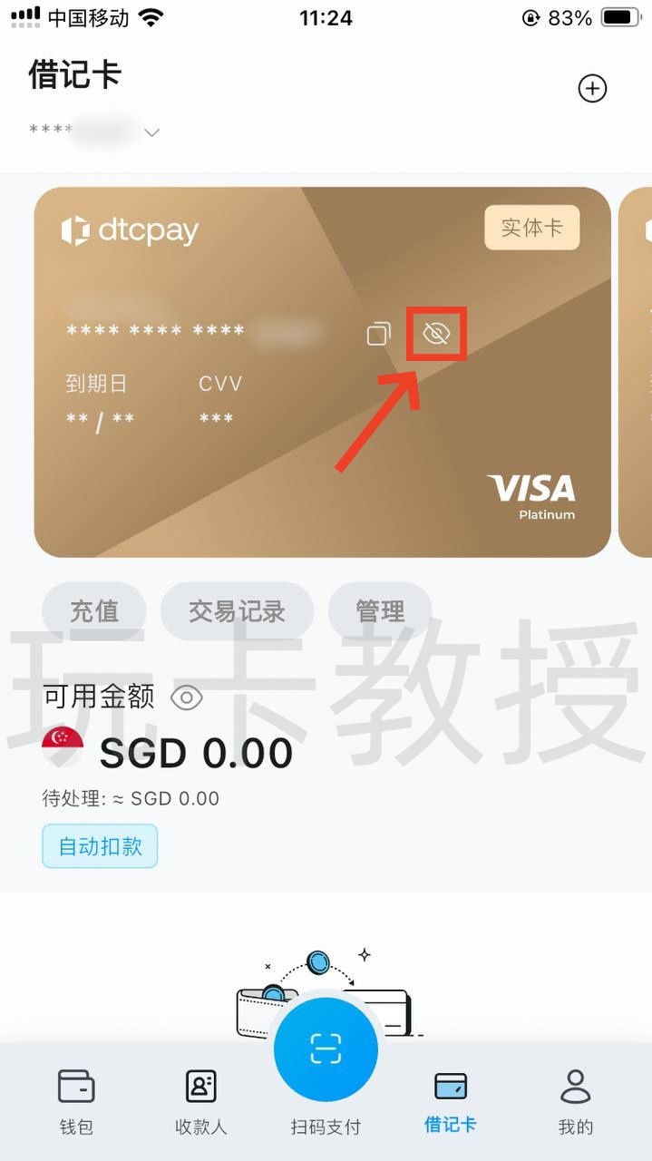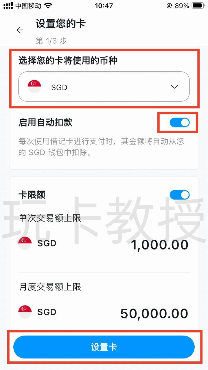 选择你的默认币种,勾选启动自动扣款,点击设置卡,创建完成卡片后,点击:小眼镜,可查看卡片详情,
