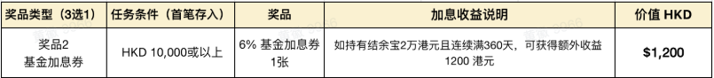 说明:加息券仅限结余宝(港元货币基金)使用,投资本金上限为2万港币,加息周期700天,累积返现上限金额1200港币。