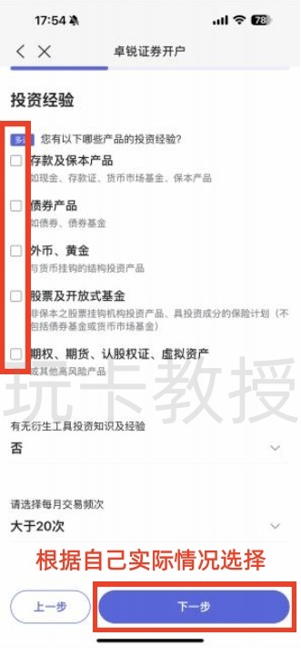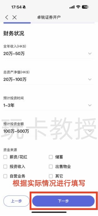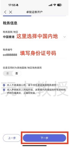 投资经验-风险测评-税务信息,选择:中国内地,税务编号:填写内地身份证