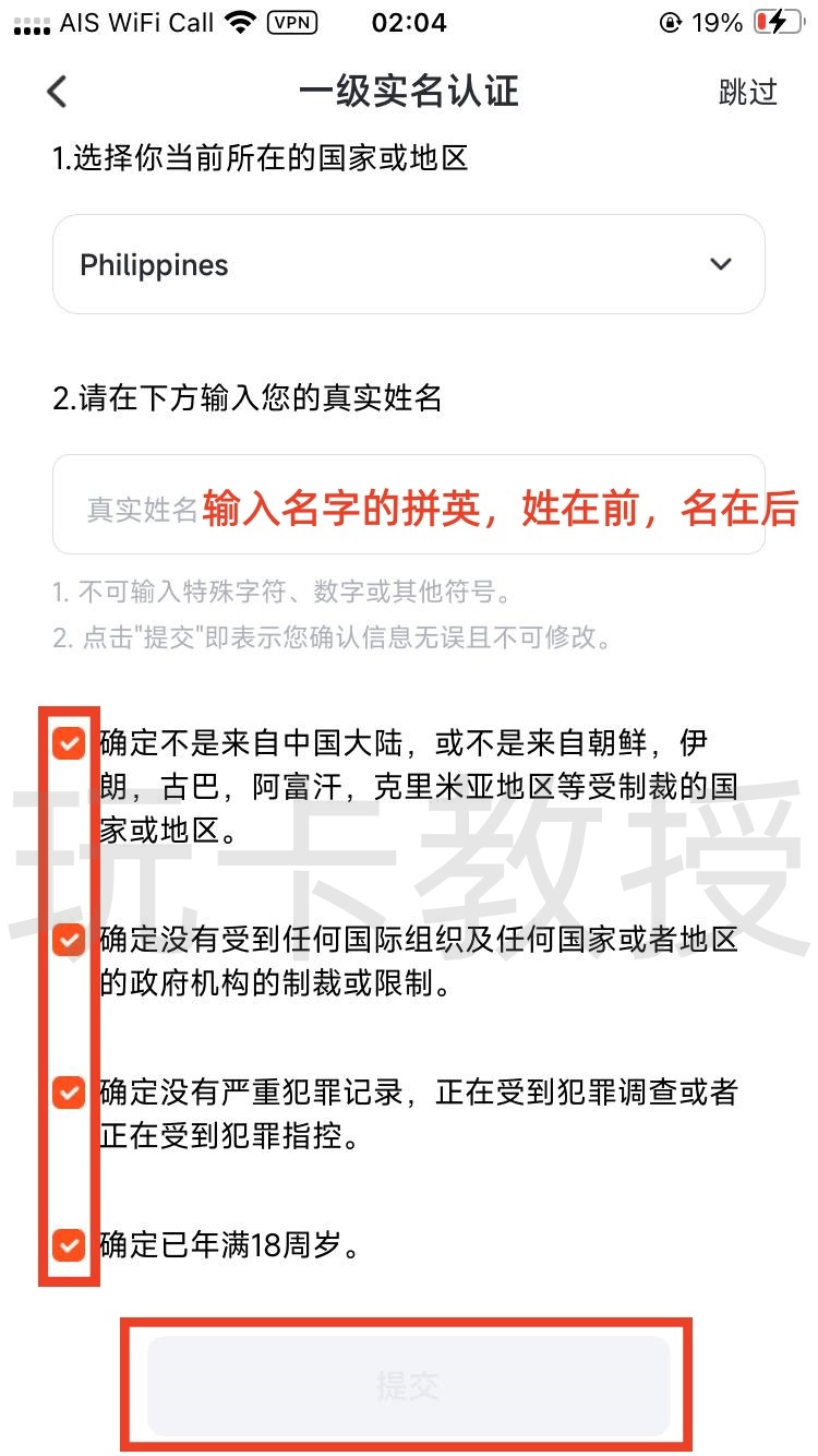 当前居住国家,选择你地址证明的居住国家,我这里以菲律宾税卡注册为例,选择菲律宾,输入你的姓名,姓在前,名在后,全部勾选,点击提交,点击左上角,进入个人中心,点击推荐人邀请码