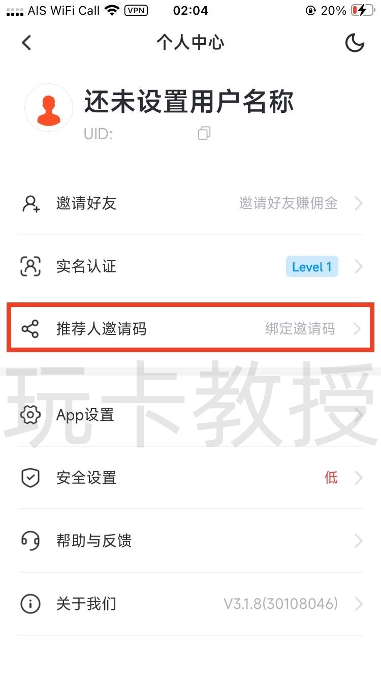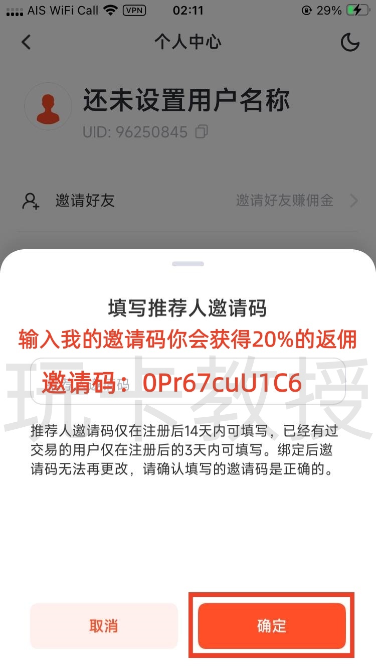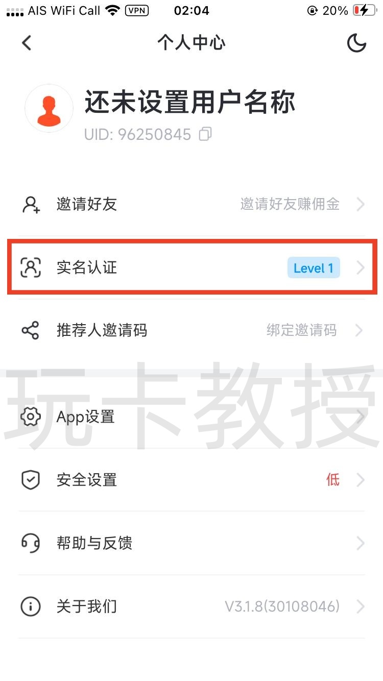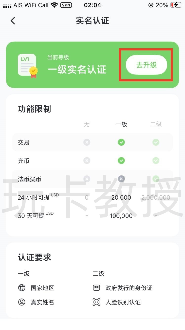 输入我的邀请码:0Pr67cuU1C6,你会获得20%的现货交易返佣,点击确定,点击实名认证,点击去升级