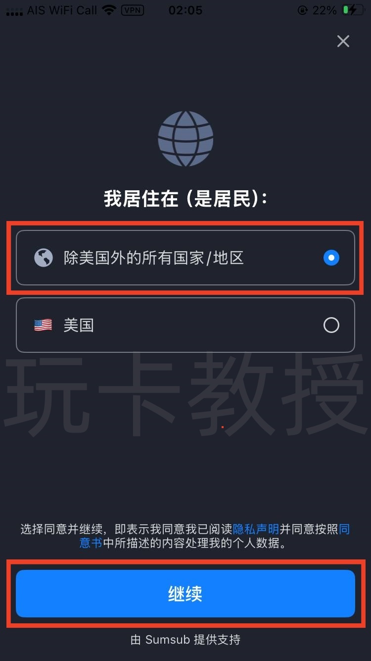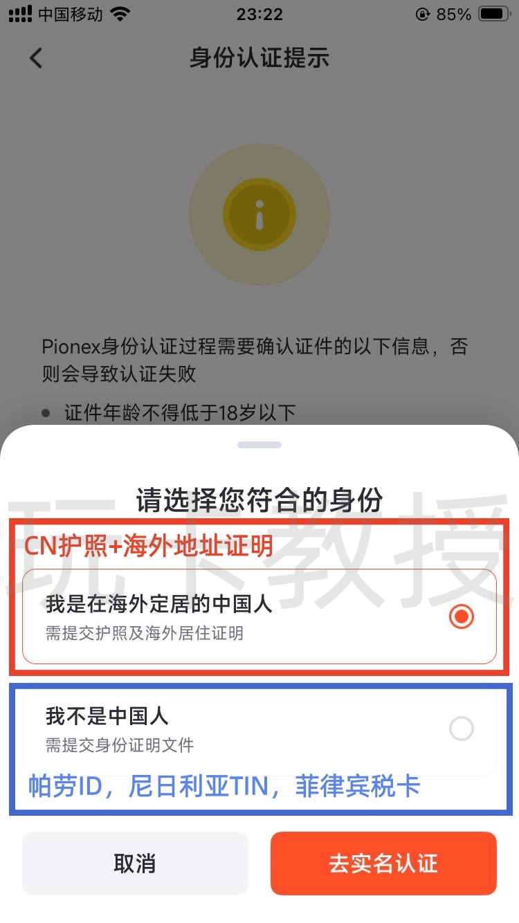 点击确定,选择身份:如果用护照+海外地址注册,选择我是在海外定居的中国人,如果用帕劳ID,尼日利亚TIN,菲律宾税卡,选择不是中国人,点击去实名认证,选择除美国外的所有国家/地区,点击继续