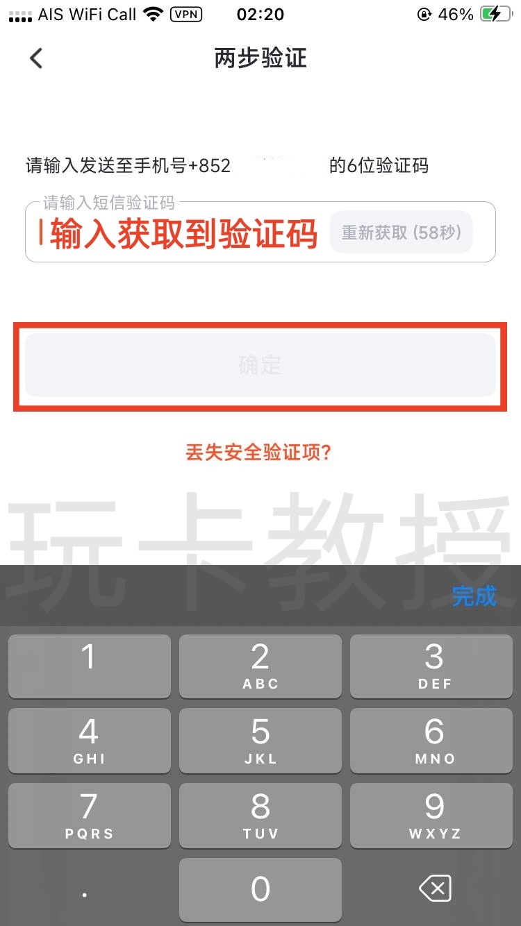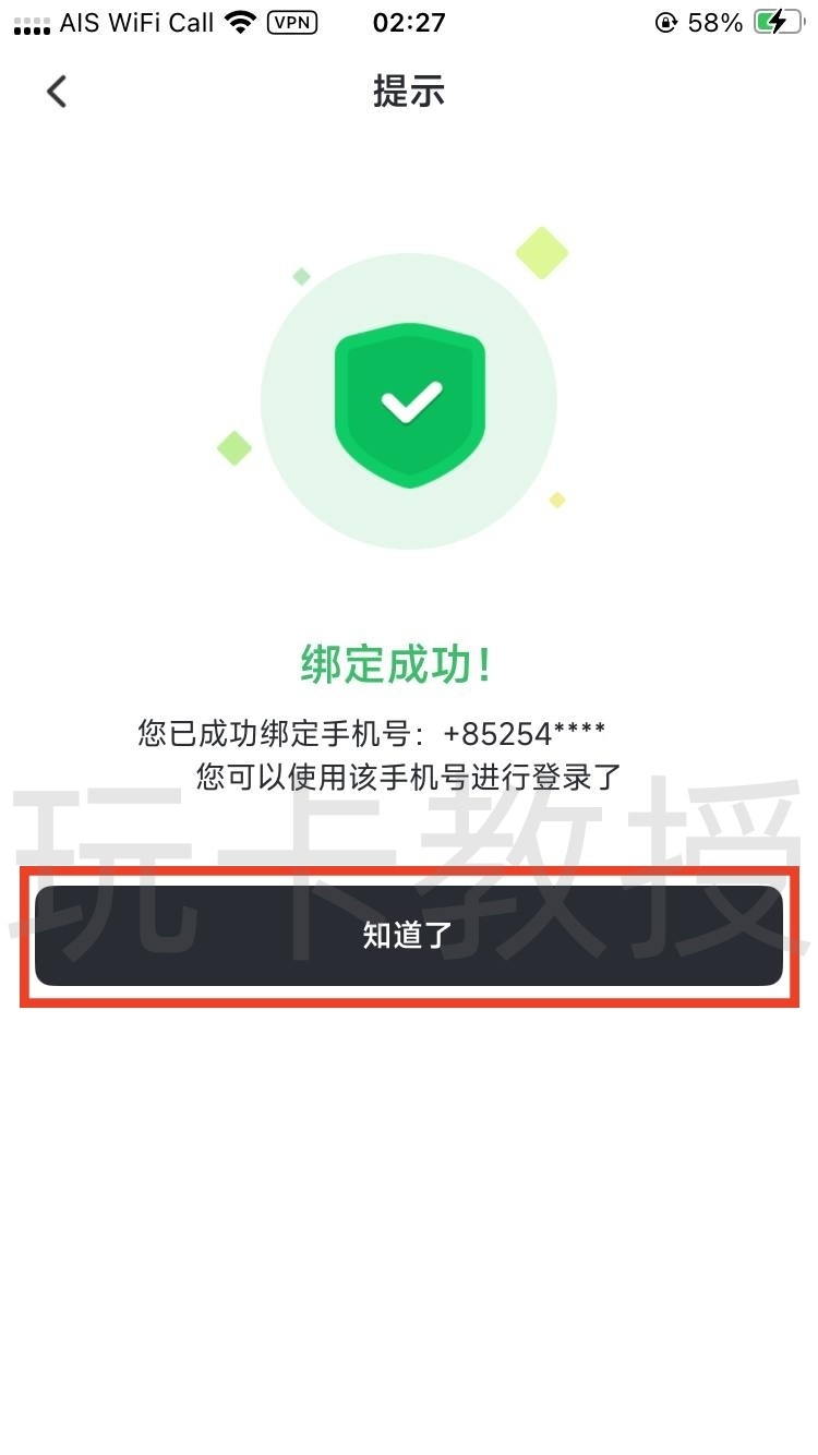 输入手机获取到的验证码,点击确定