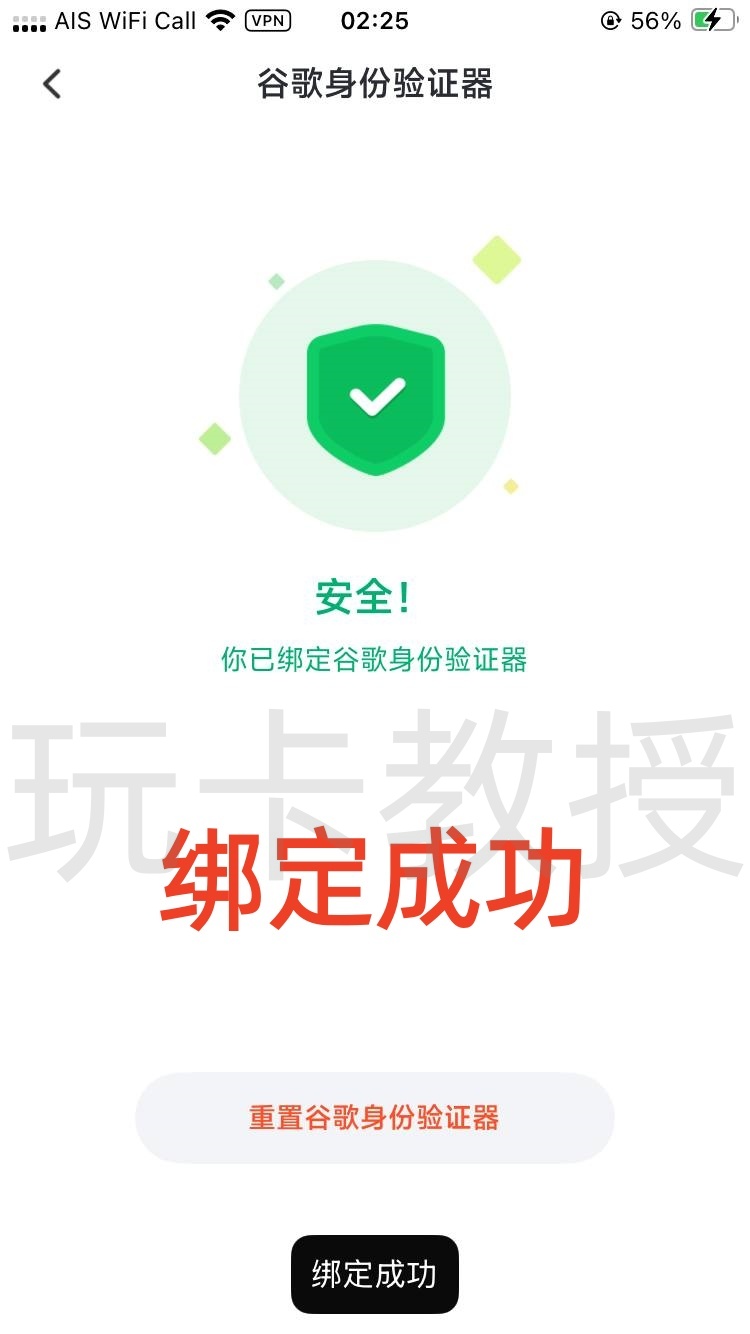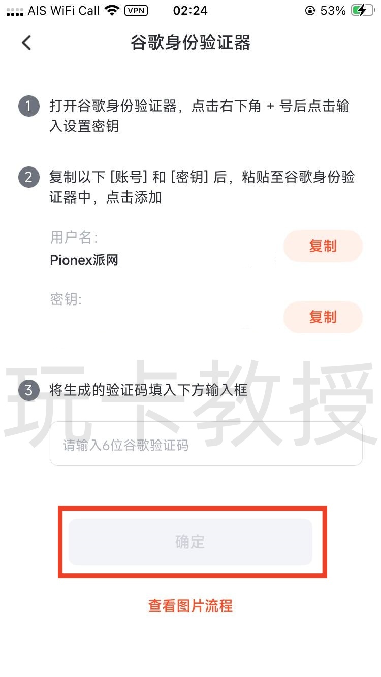 复制密钥到Google验证器,输入Google验证码的验证码,点击确定