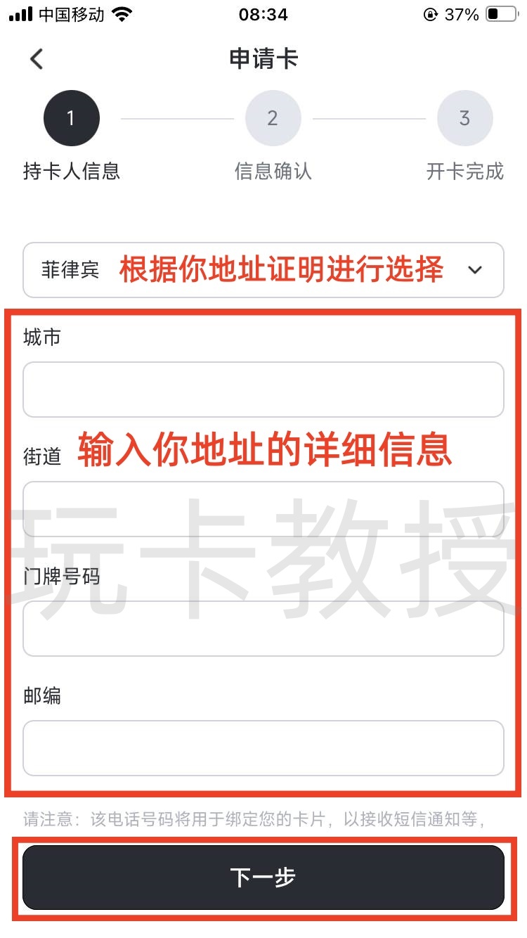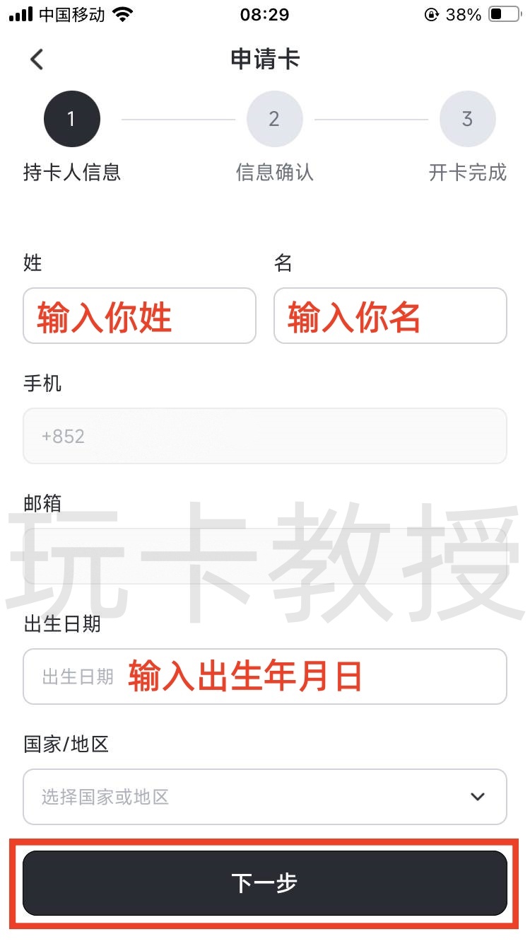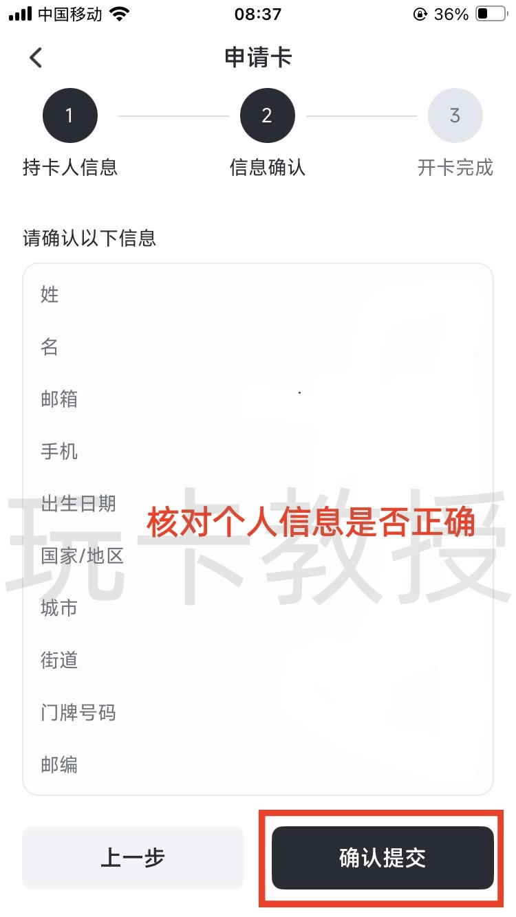 输入你的姓名,出生年月,账单地址信息,点击下一步,确认信息,点击提交