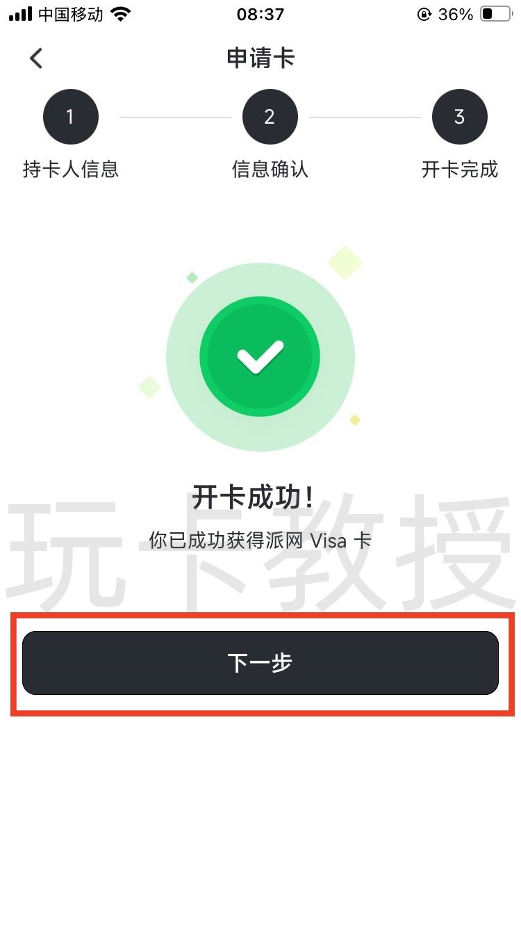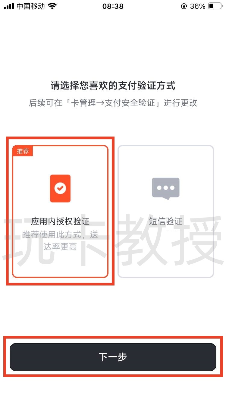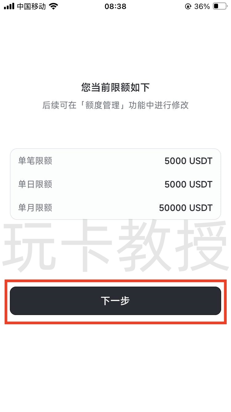 开卡成功后,点击下一步,选择应用内授权验证,点击下一步,可以看到我们的限额,这个限额我们大部分都够用,点击下一步